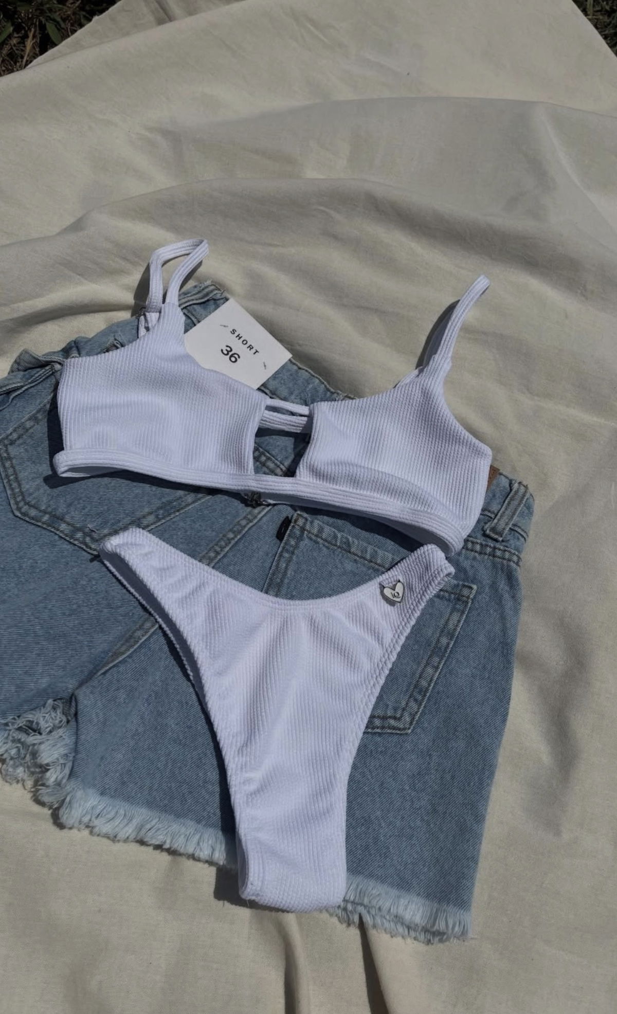 Corpiño top con abertura en el centro del busto, tiene breteles regulables. En la espalda tiene doble tira y broche. Bombacha entera, colaless. Echa en tela texturada, la vas a amar!