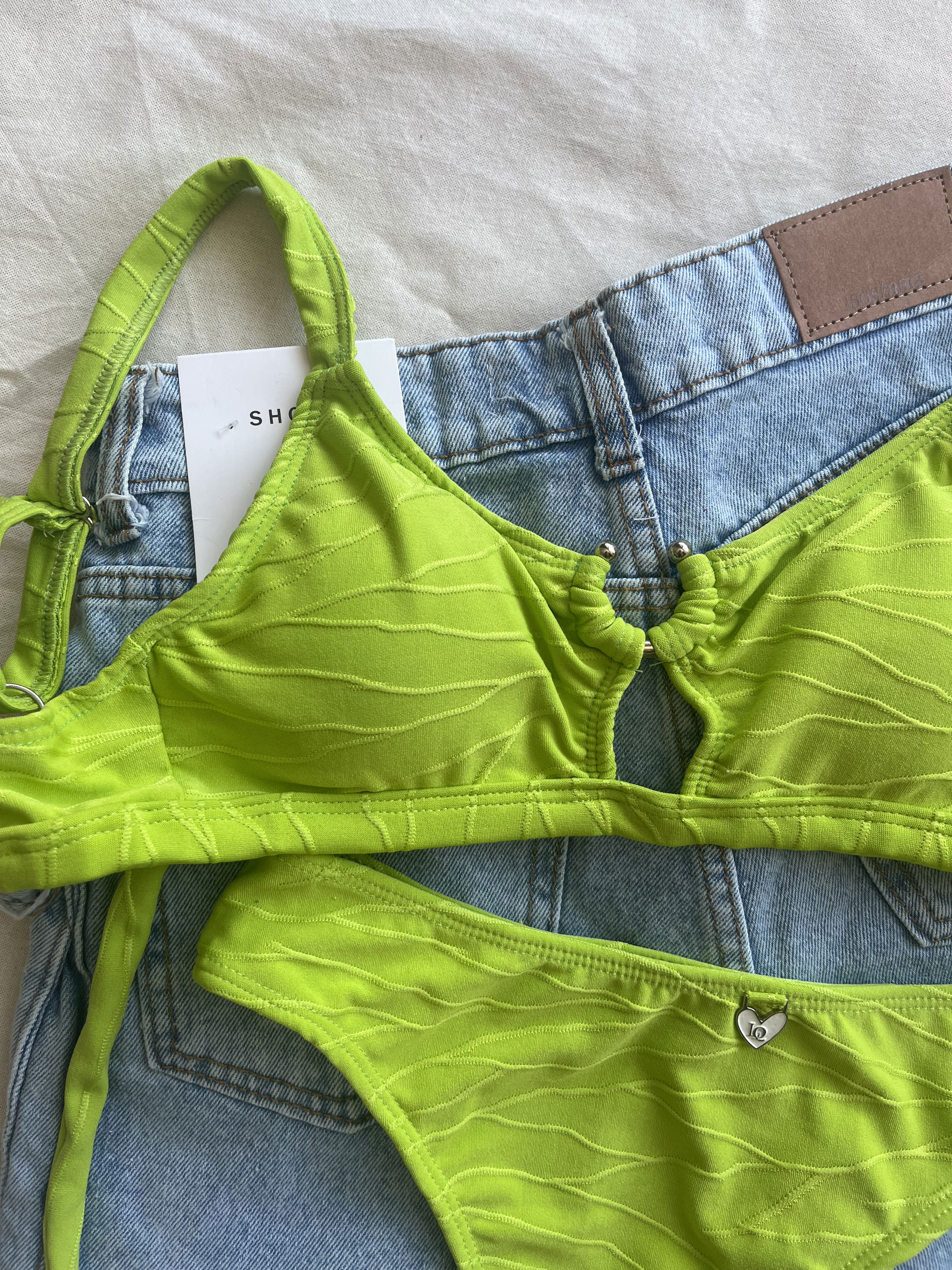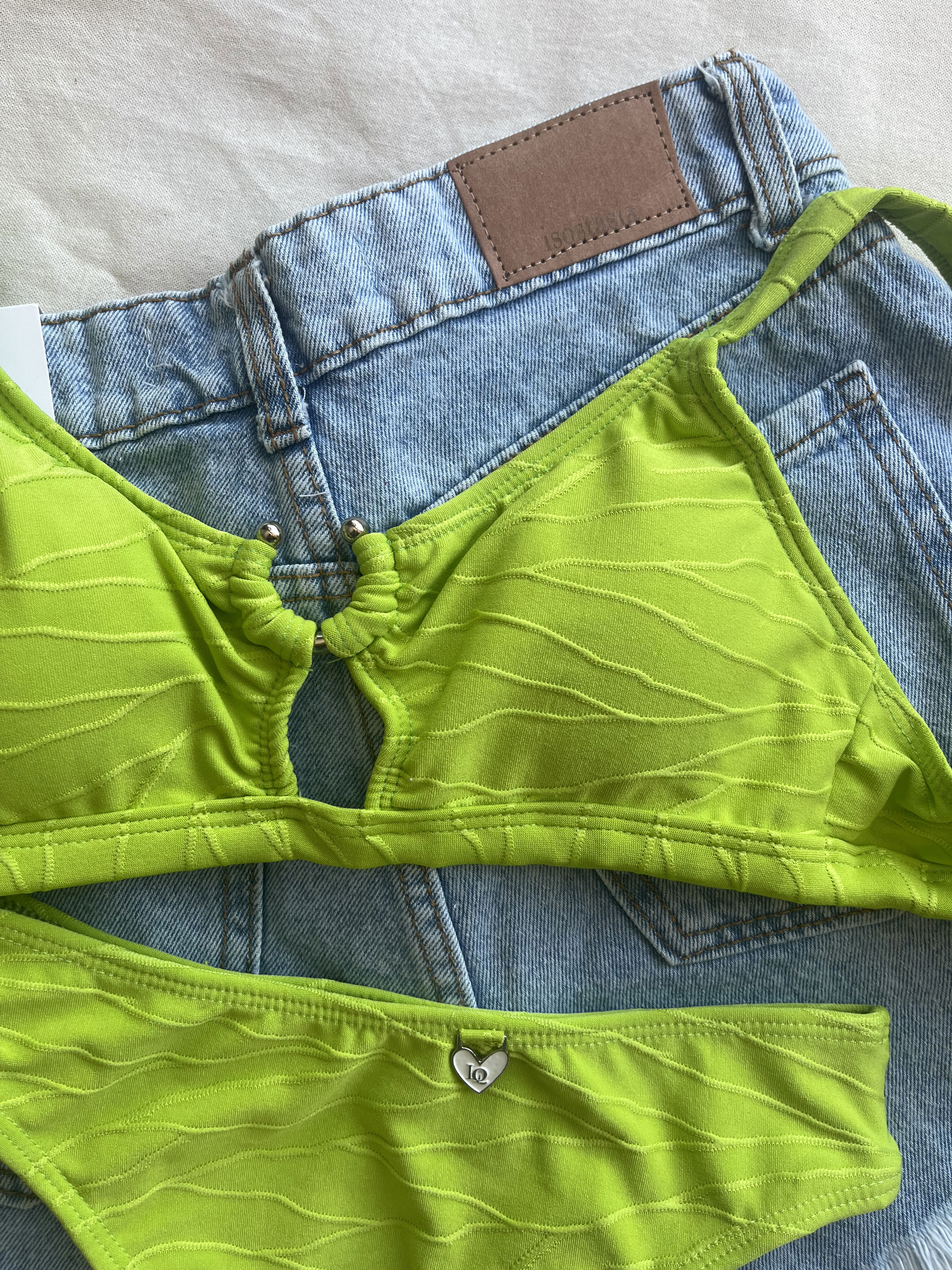 Top con herraje, breteles regulables y espalda para atar. Colaless tiro alto