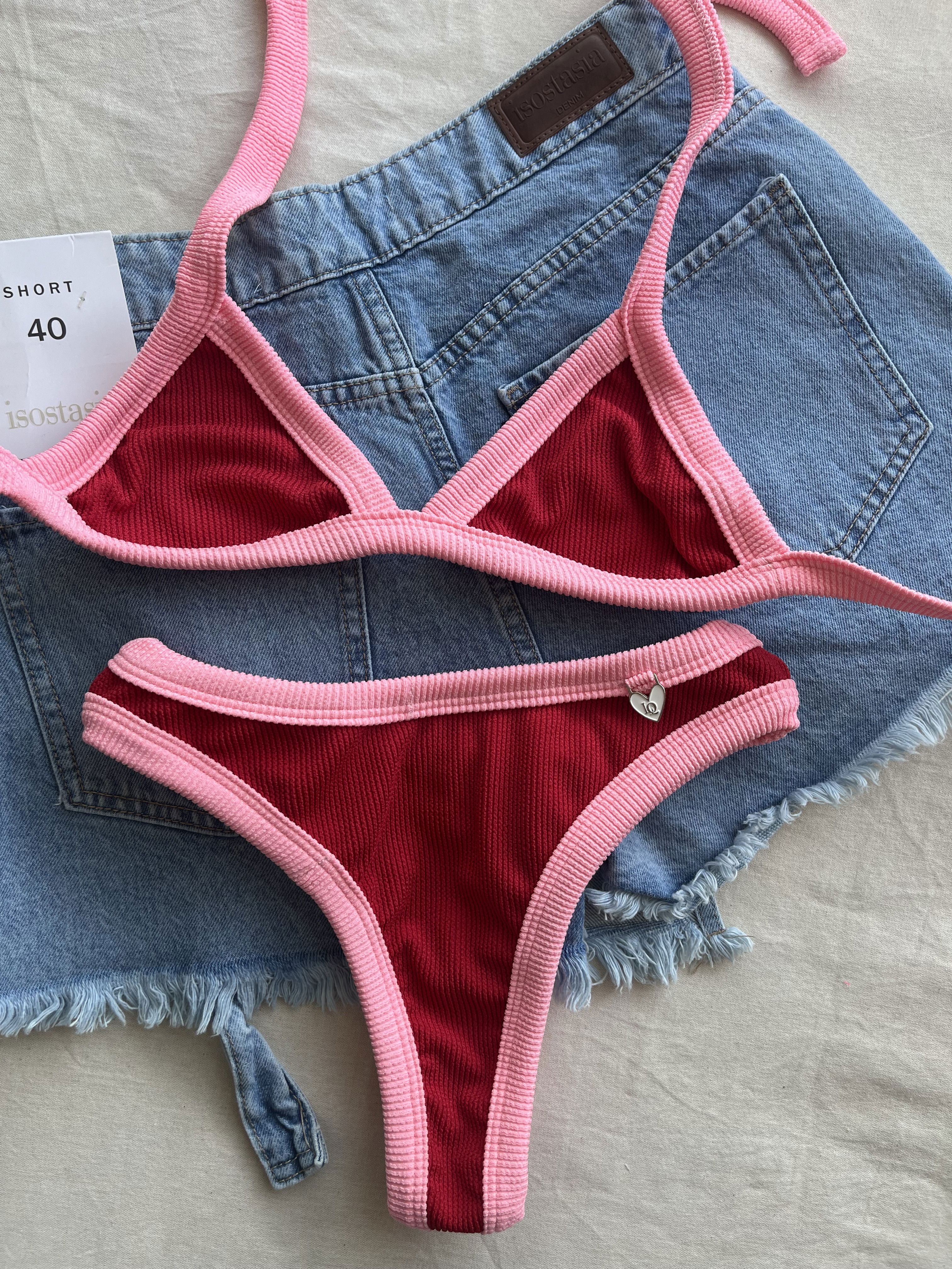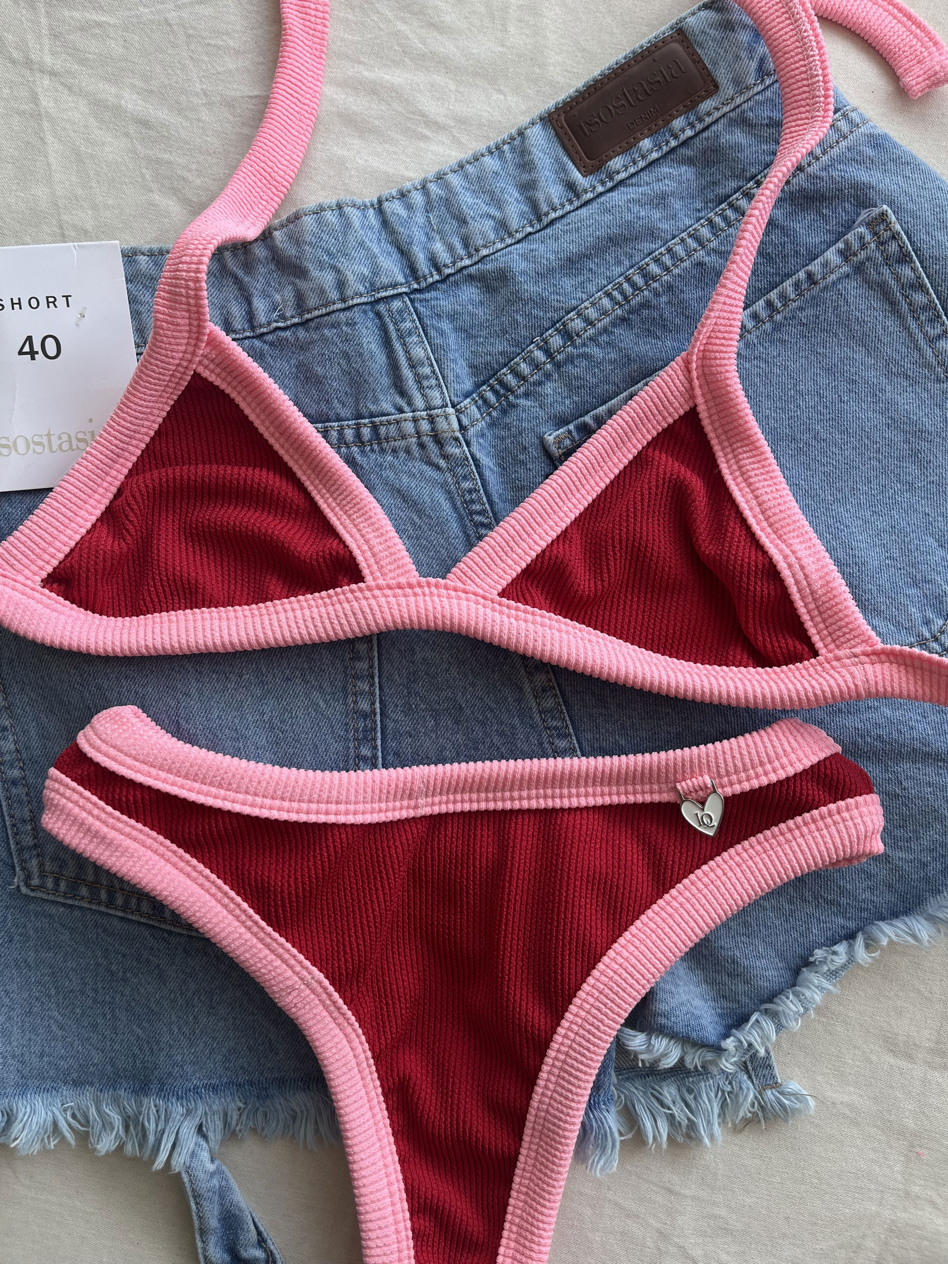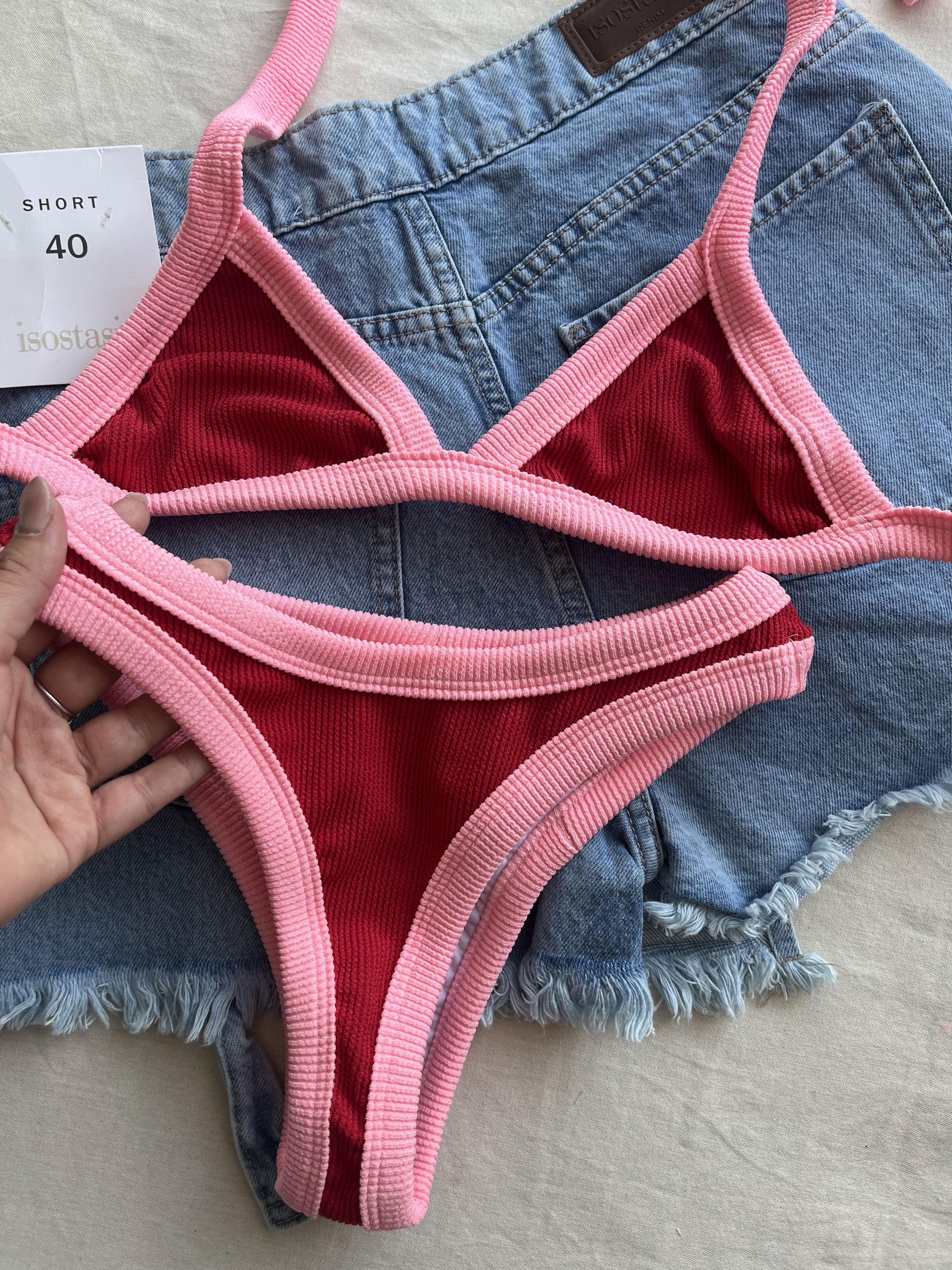 Triángulo con tiras para atar y colaless entera. El corpiño NO TRAE tazas desmontables pero TIENE ABERTURA PARA AGREGARLE.