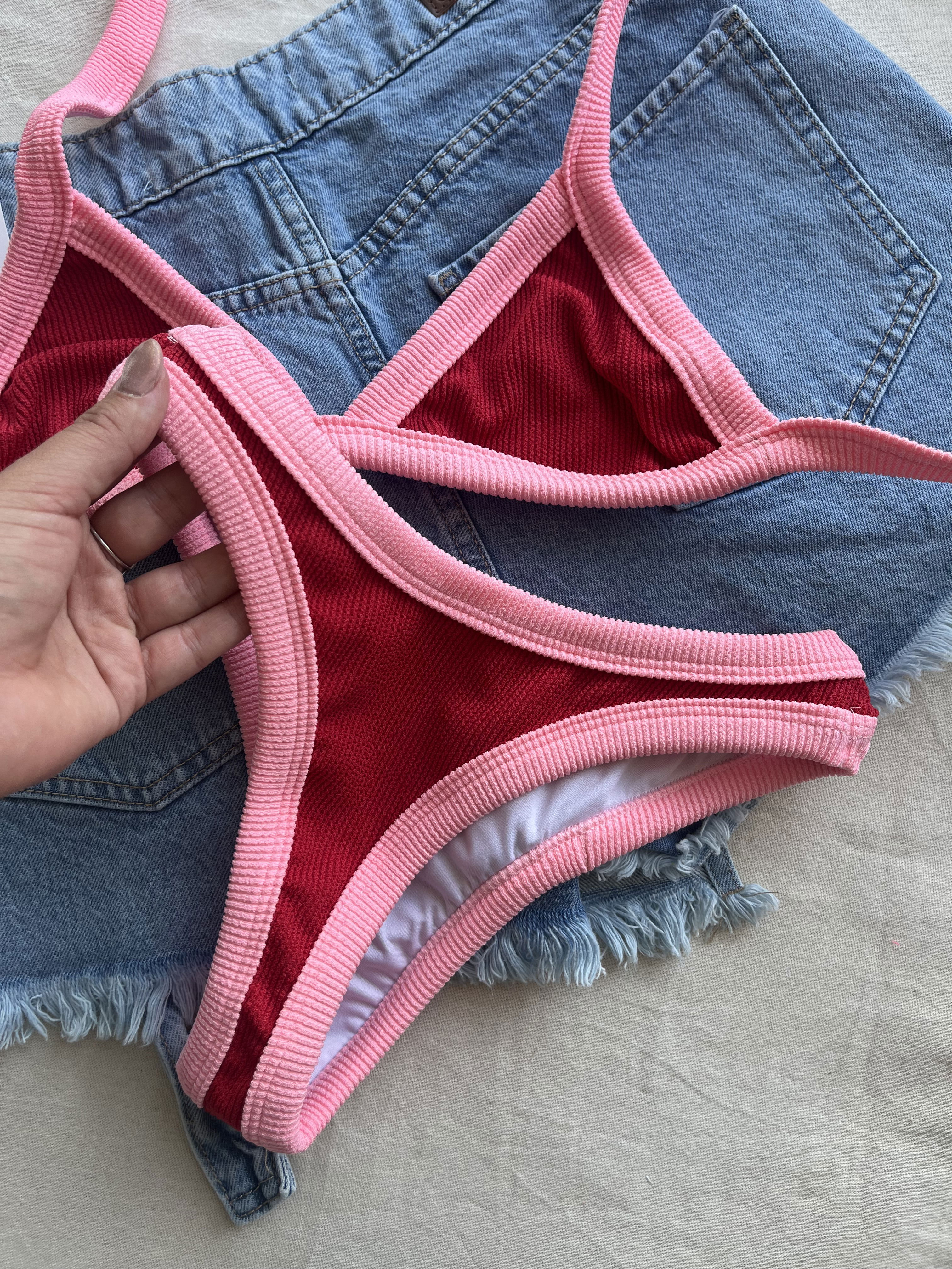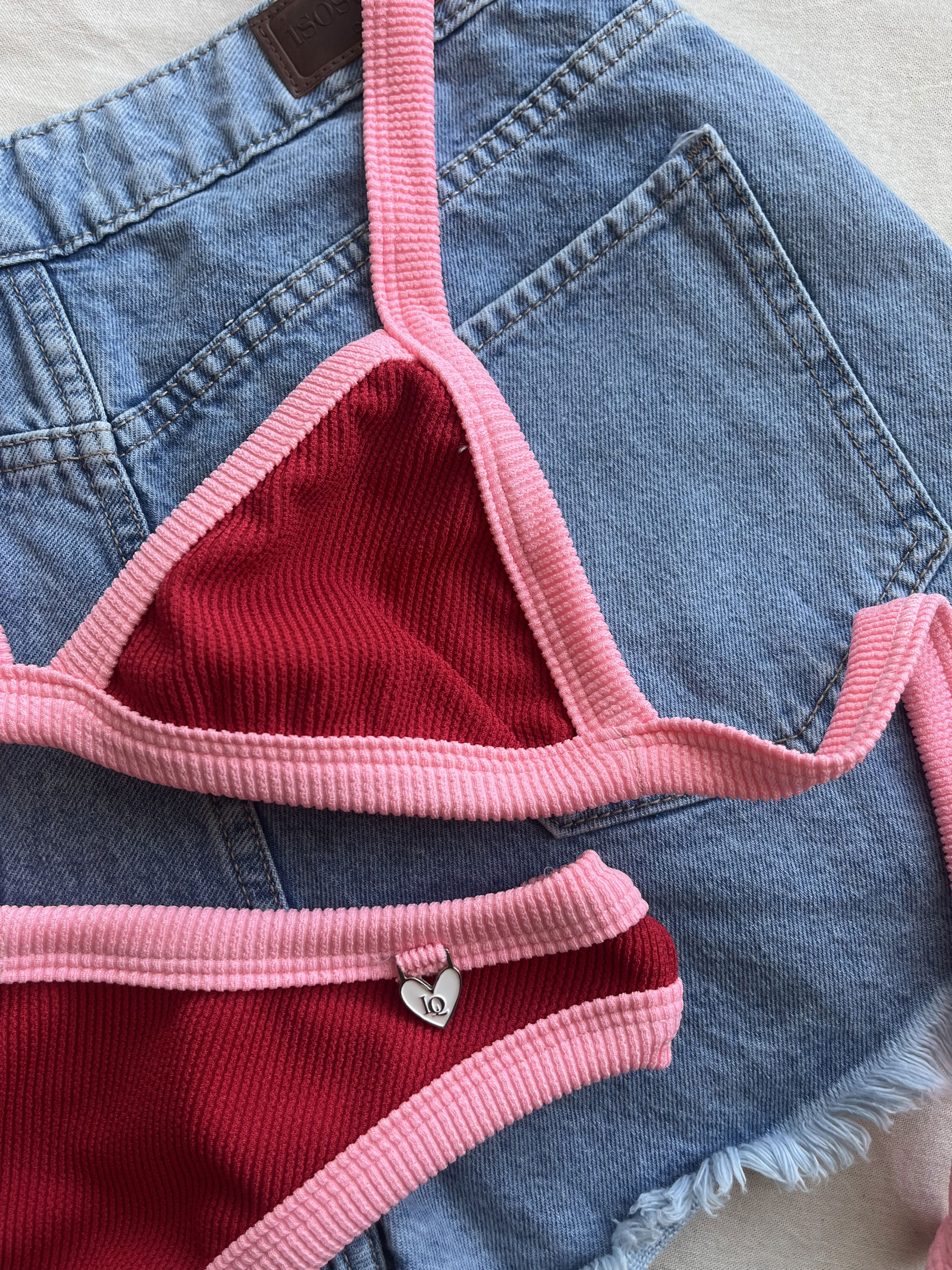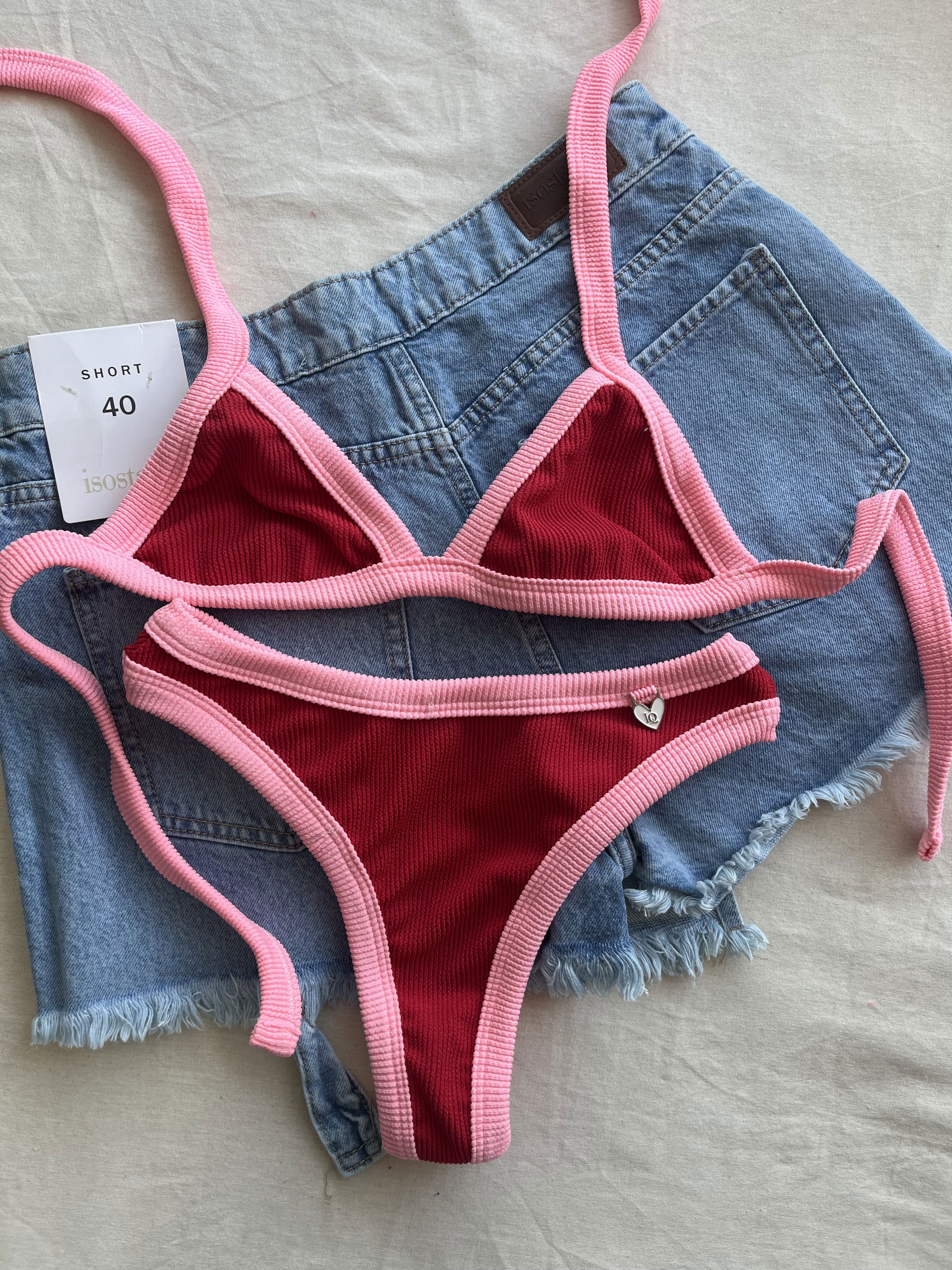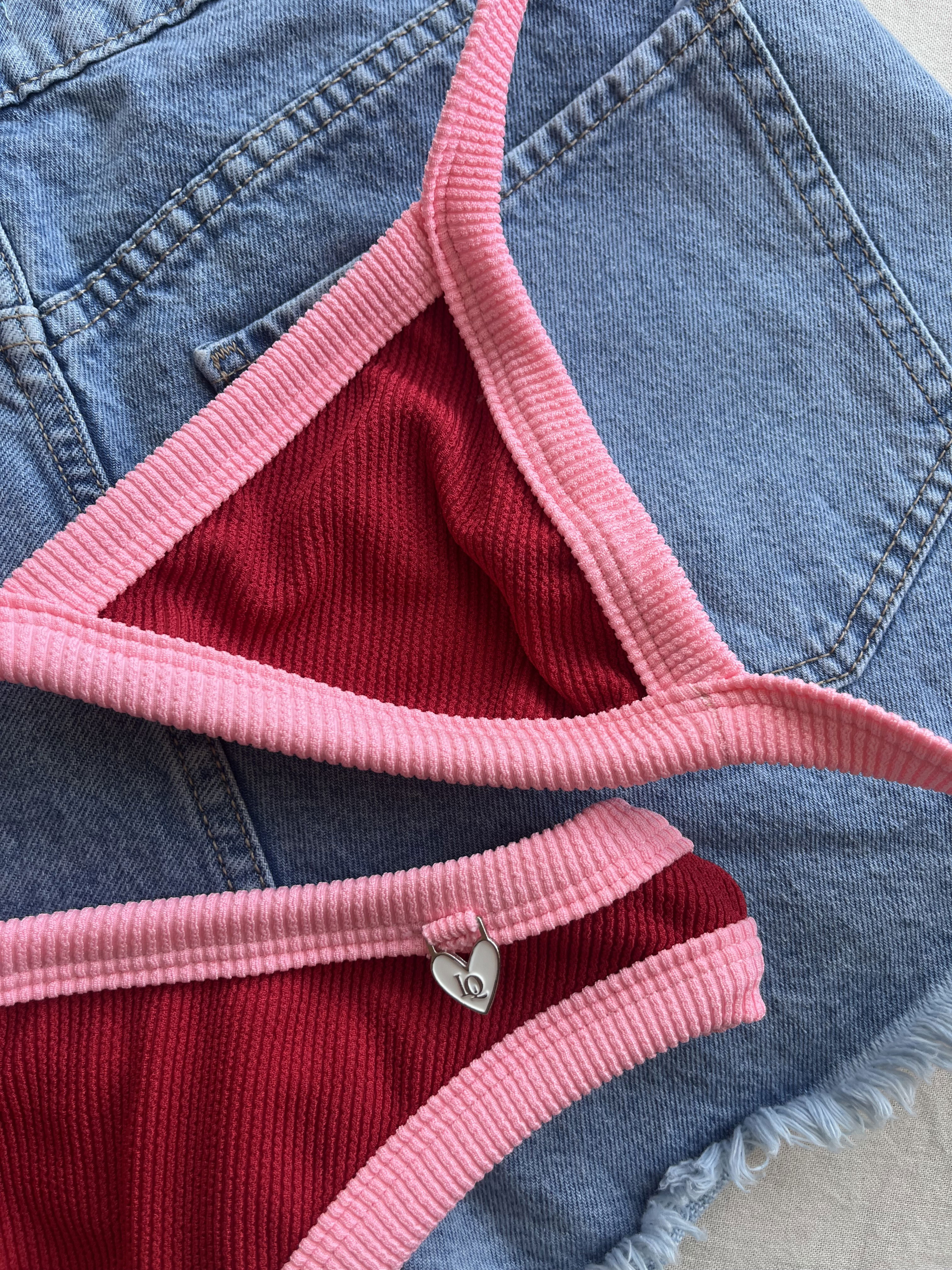 Triángulo con tiras para atar y colaless entera. El corpiño NO TRAE tazas desmontables pero TIENE ABERTURA PARA AGREGARLE.