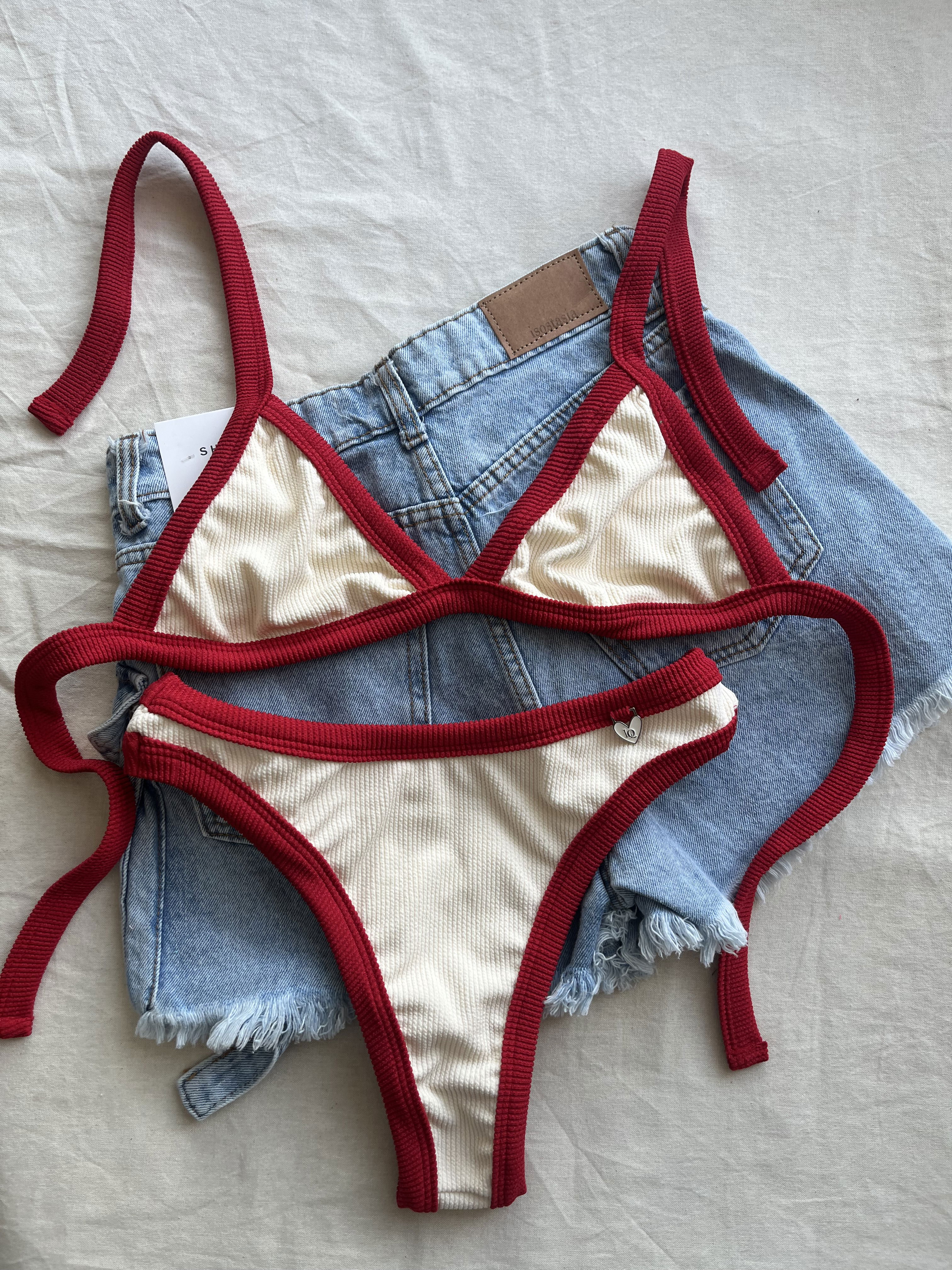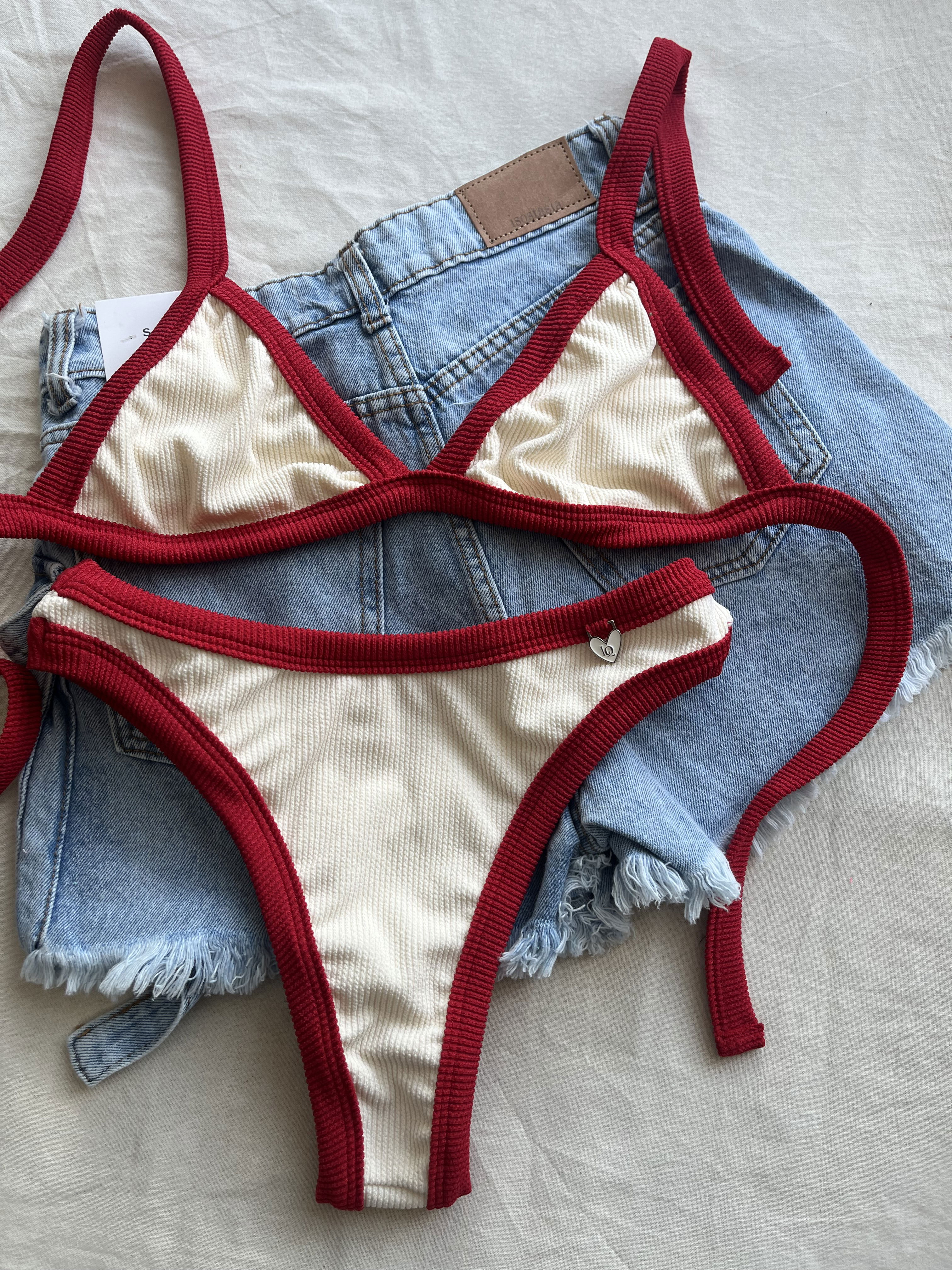 Triángulo con tiras para atar y colaless entera. El corpiño NO TRAE tazas desmontables pero TIENE ABERTURA PARA AGREGARLE.