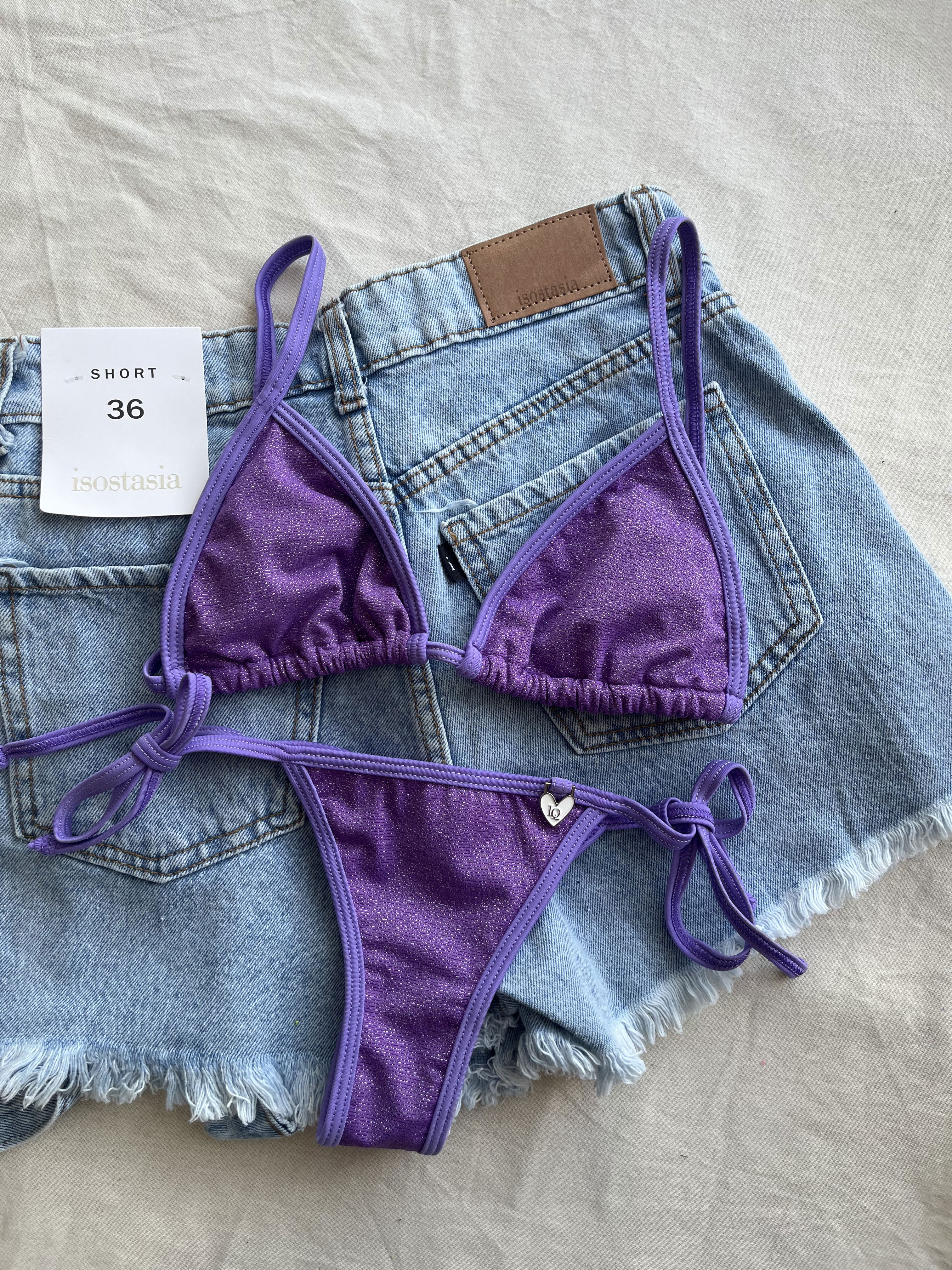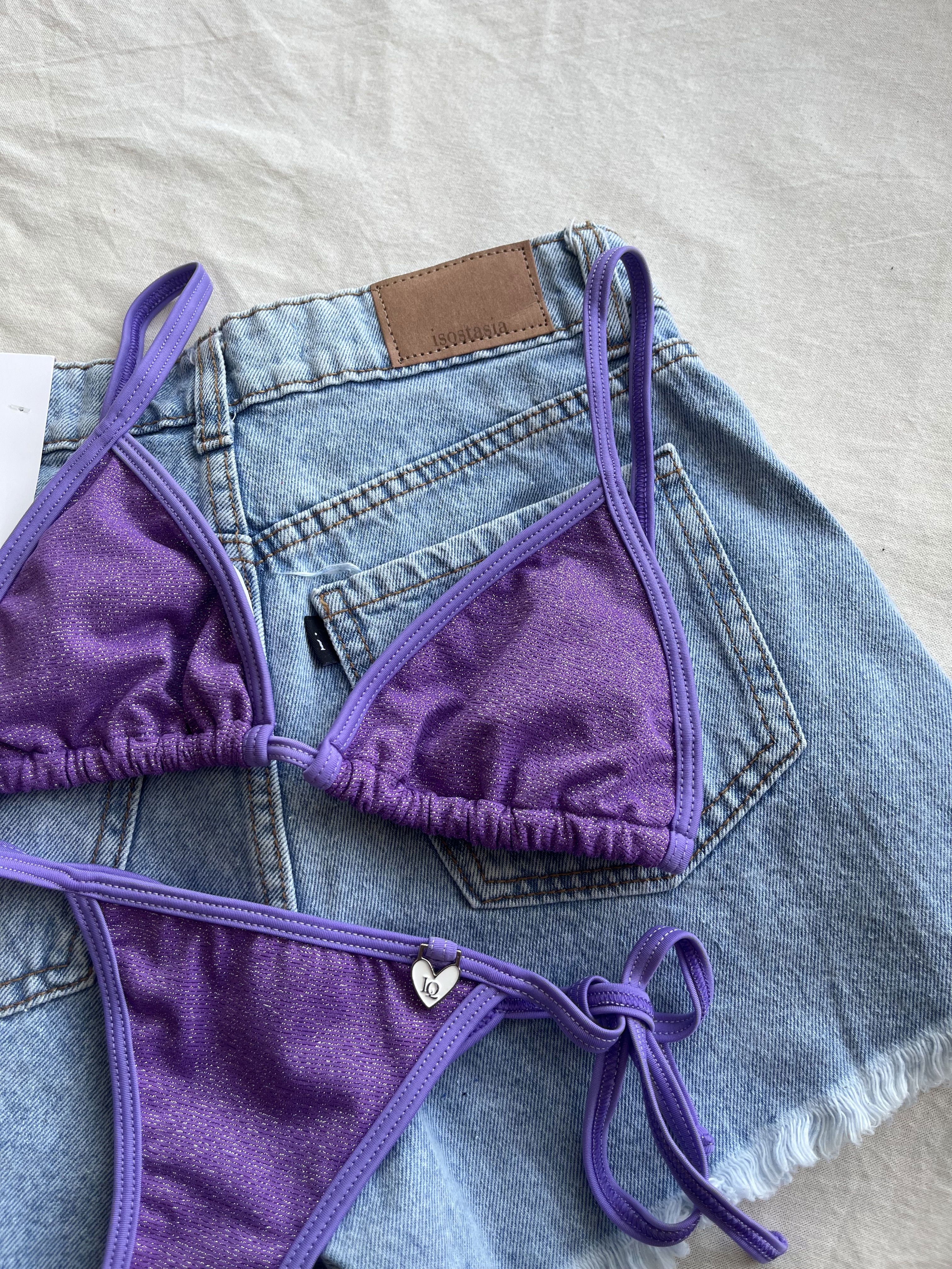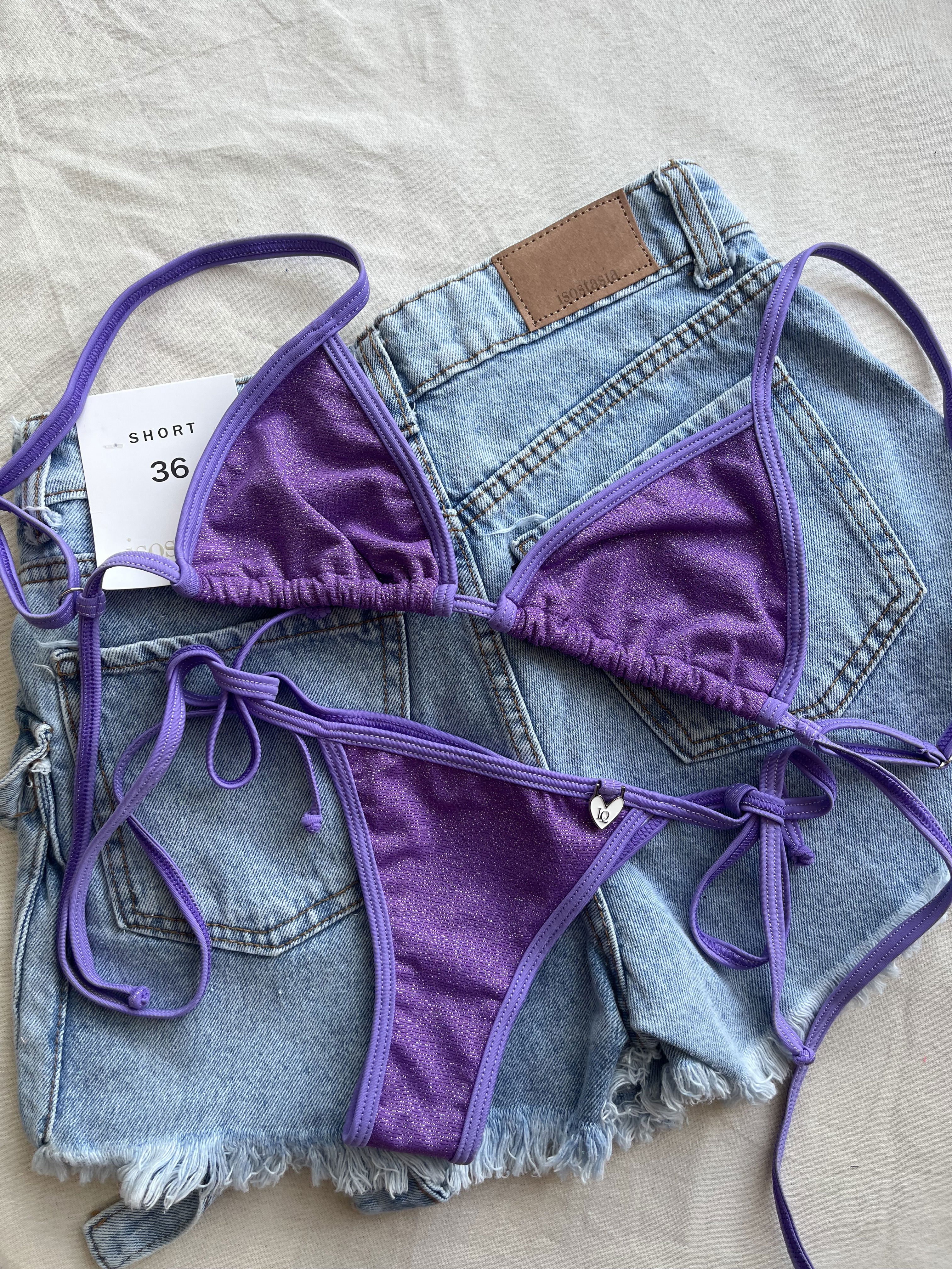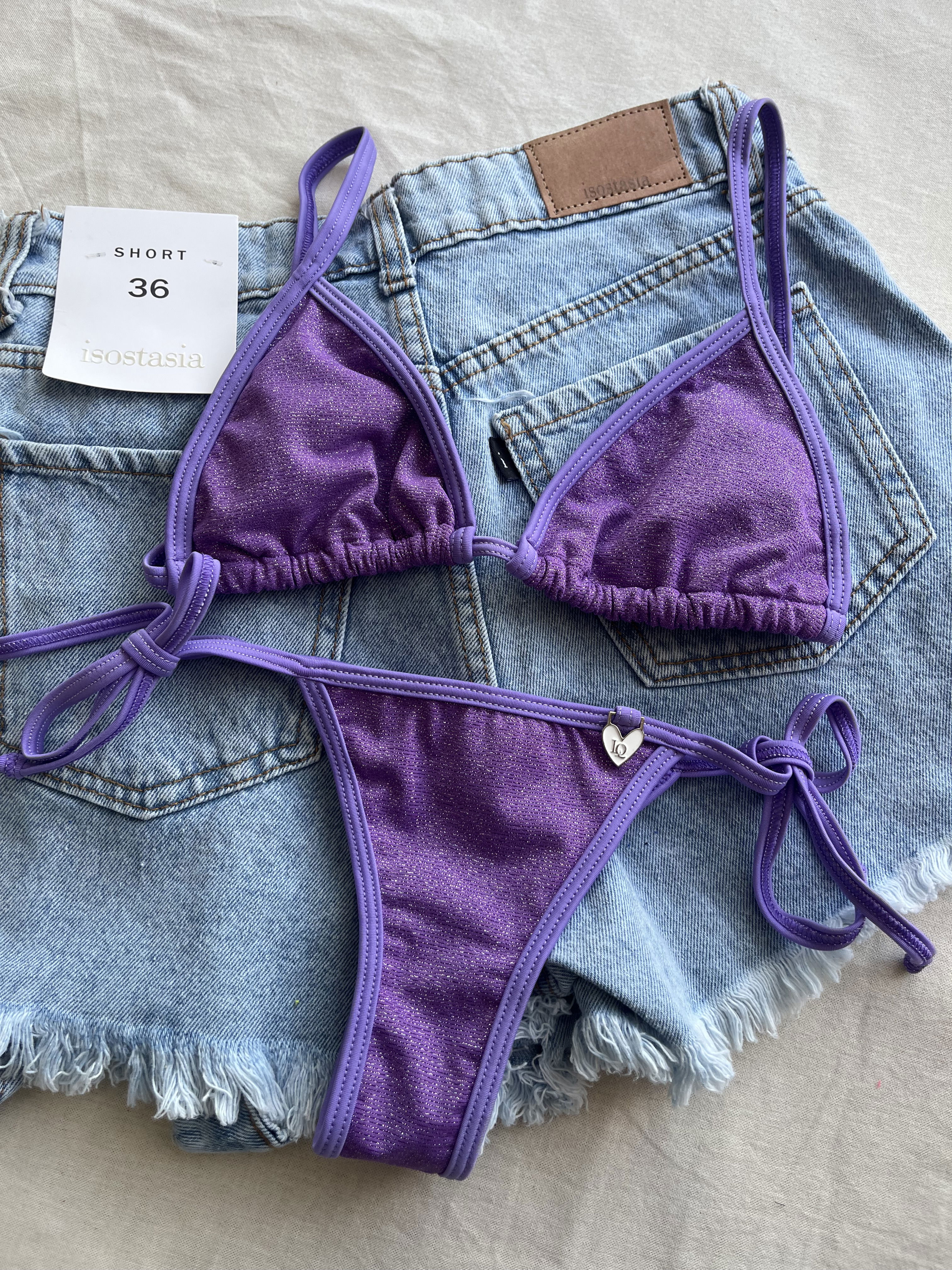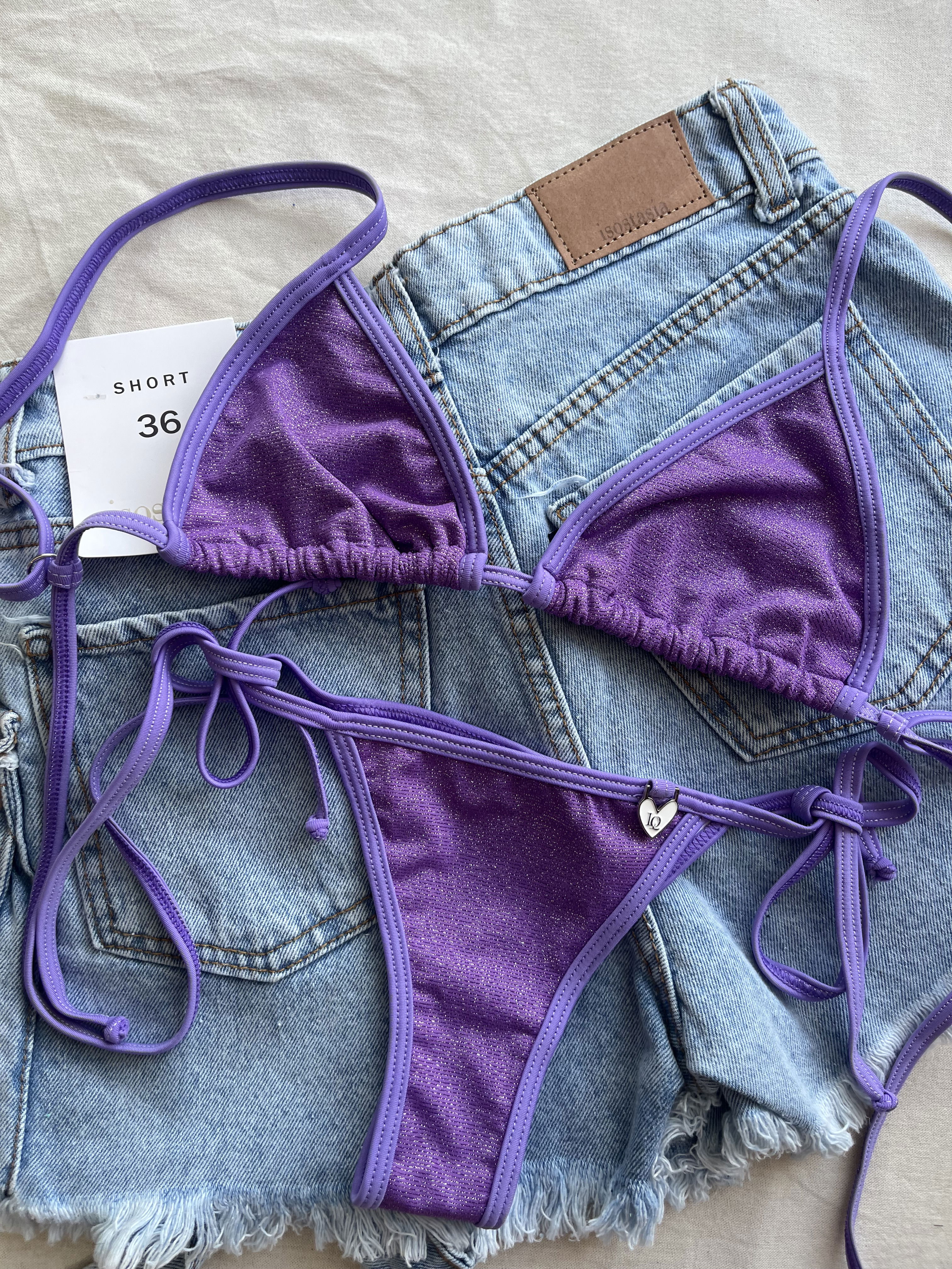 Triángulito de lurex y vivos en tricot , espalda para atar y breteles regulables. Bombi colaless con tiritas para atar.