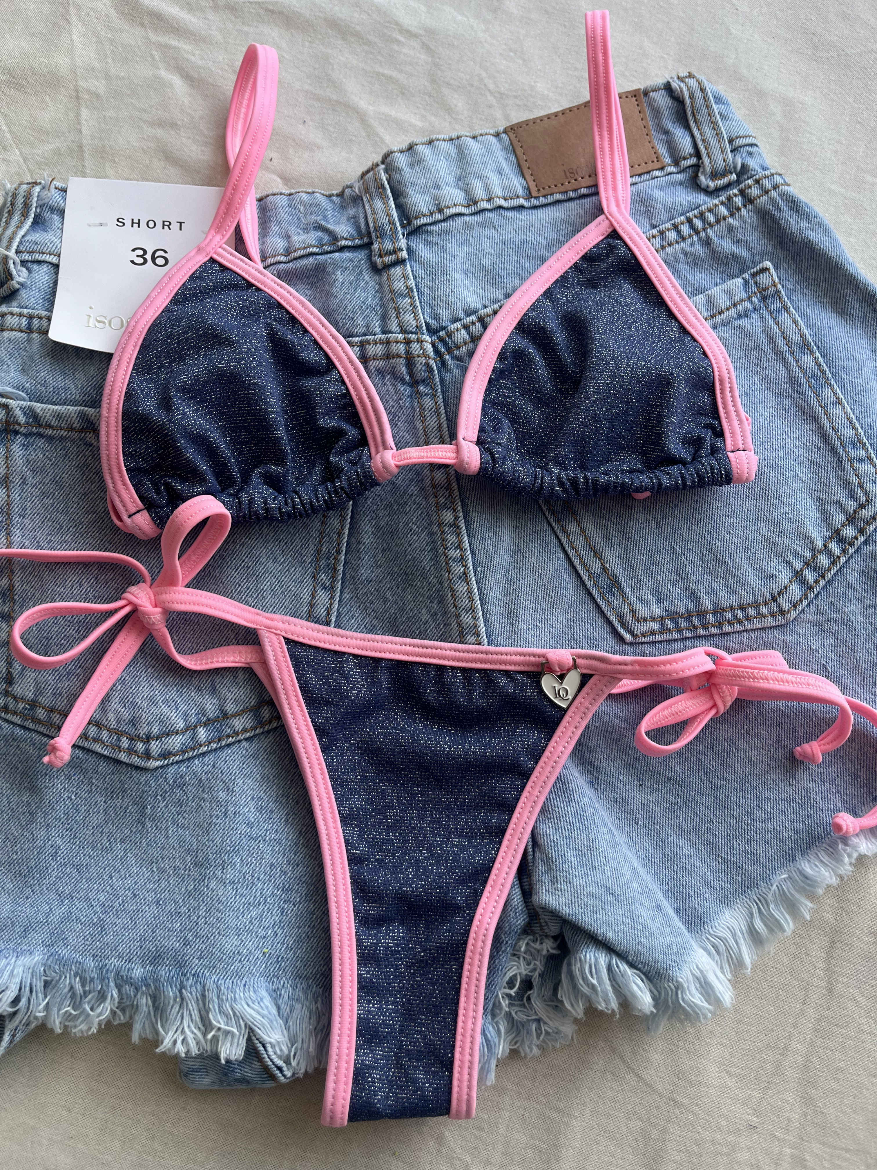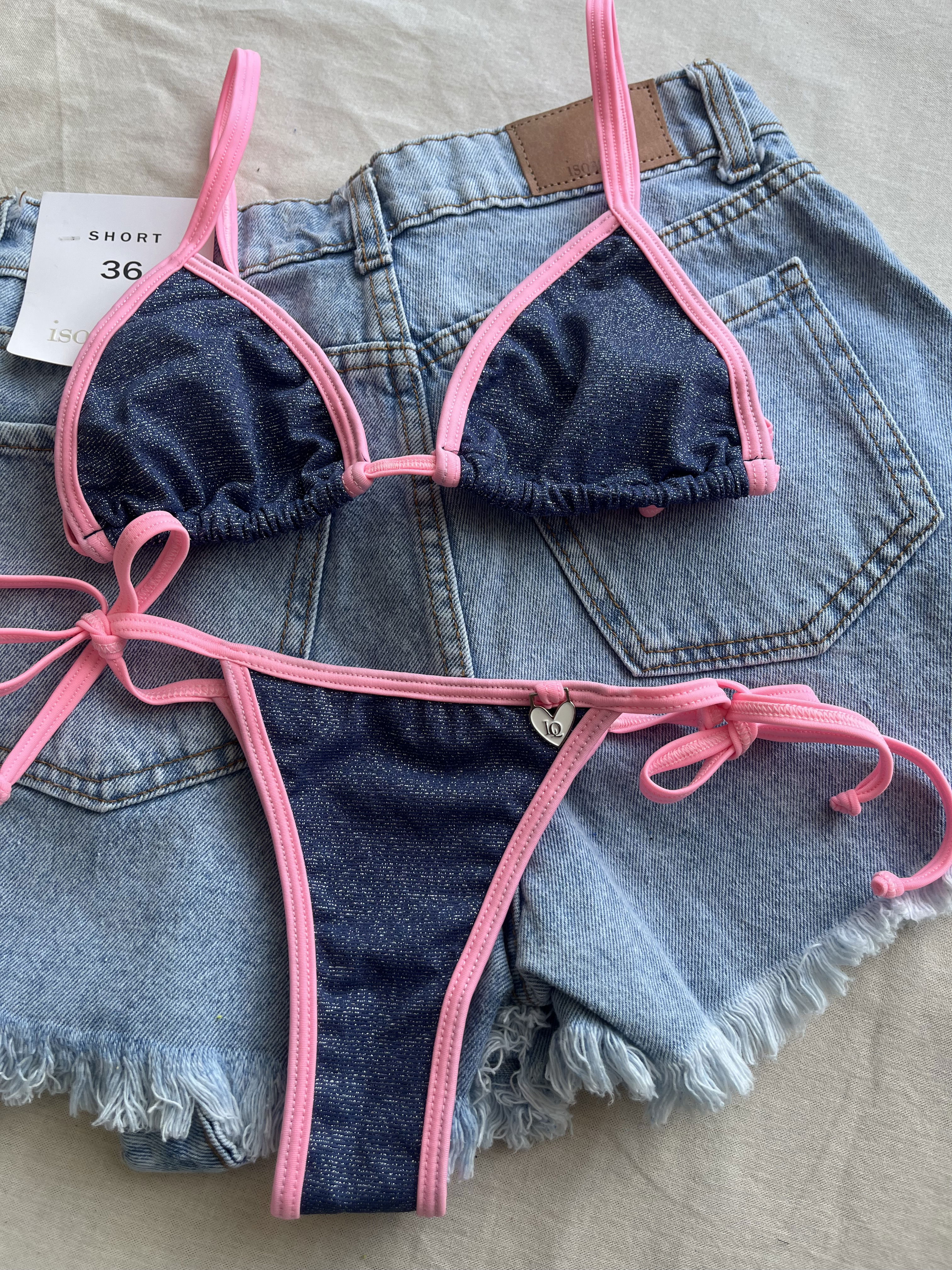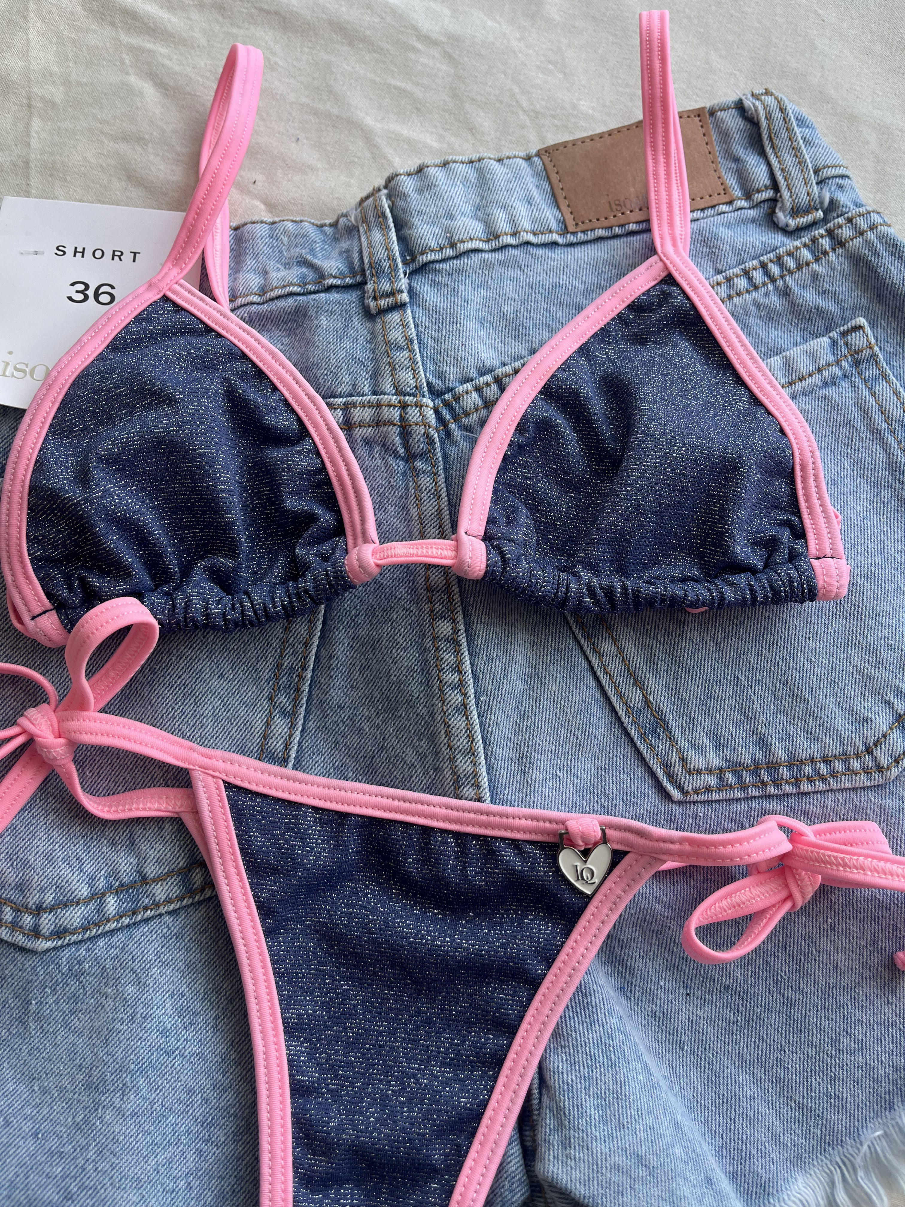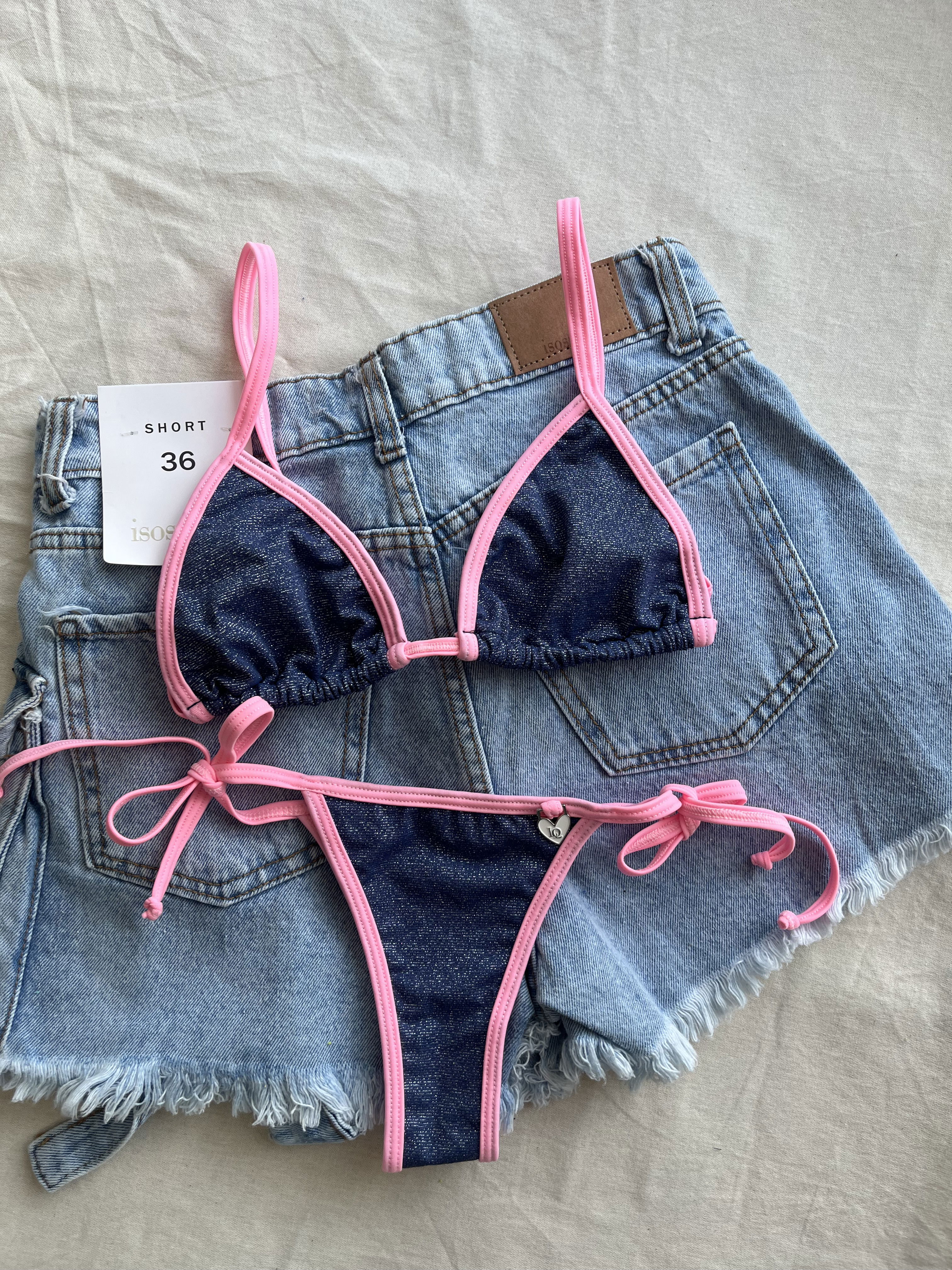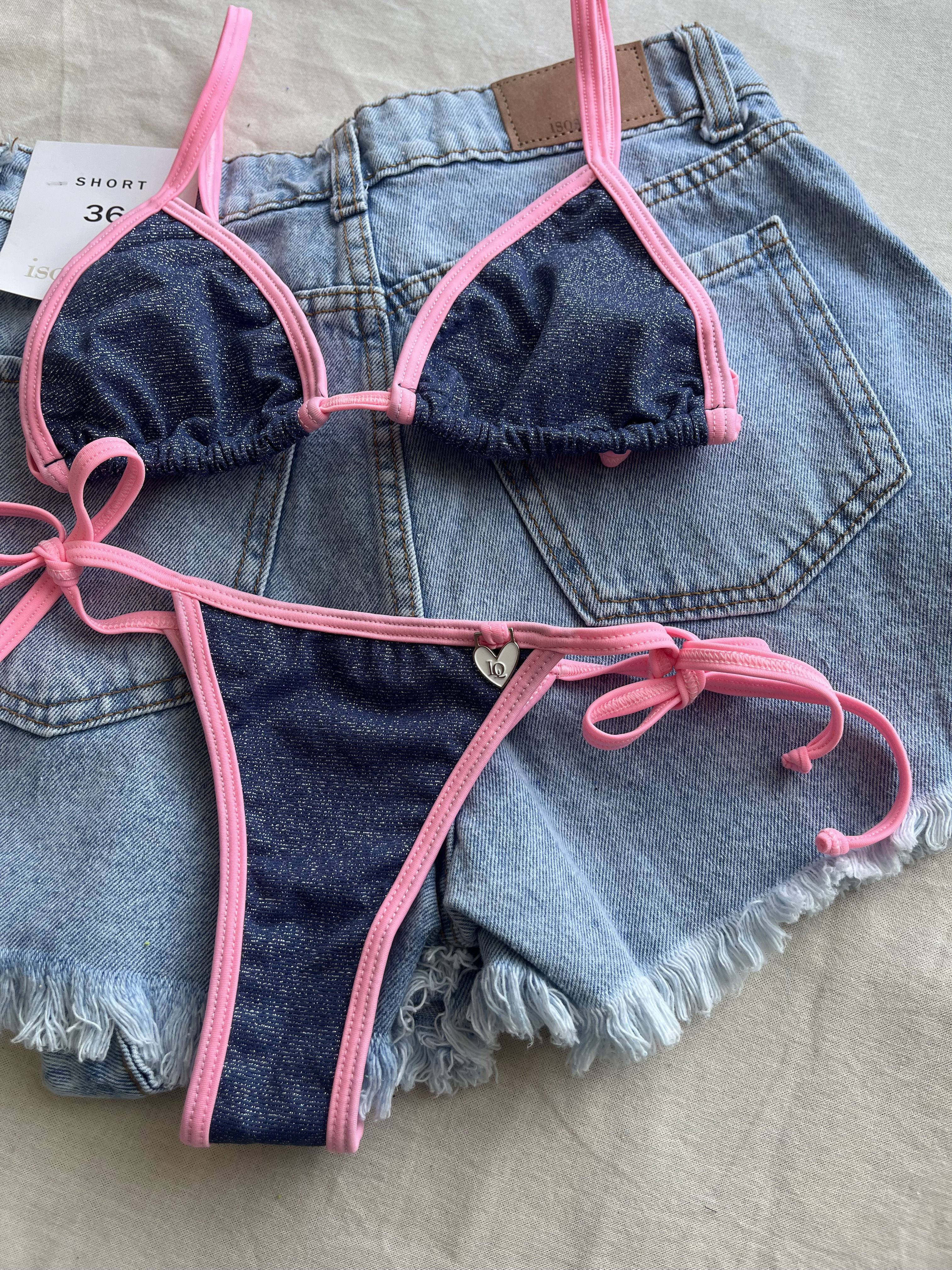 Triángulito de lurex y vivos en tricot , espalda para atar y breteles regulables. Bombi colaless con tiritas para atar.