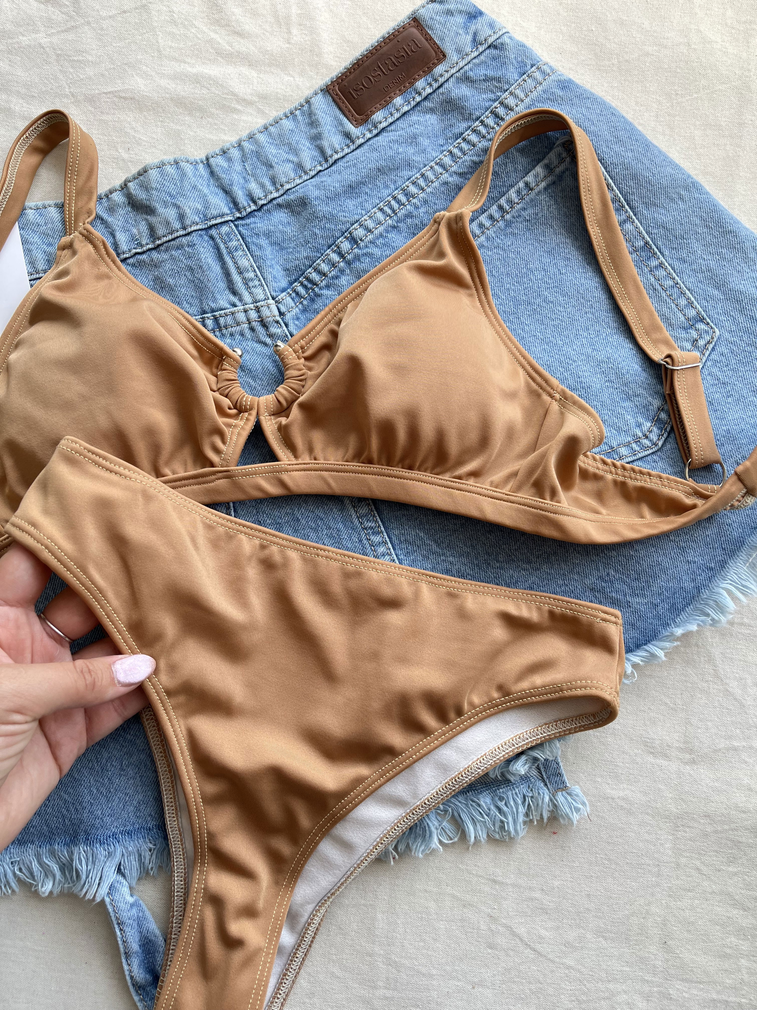 Corpiño top con herraje, de tricot, con breteles regulables y espalda para atar. Bombo colaless tiro alto
