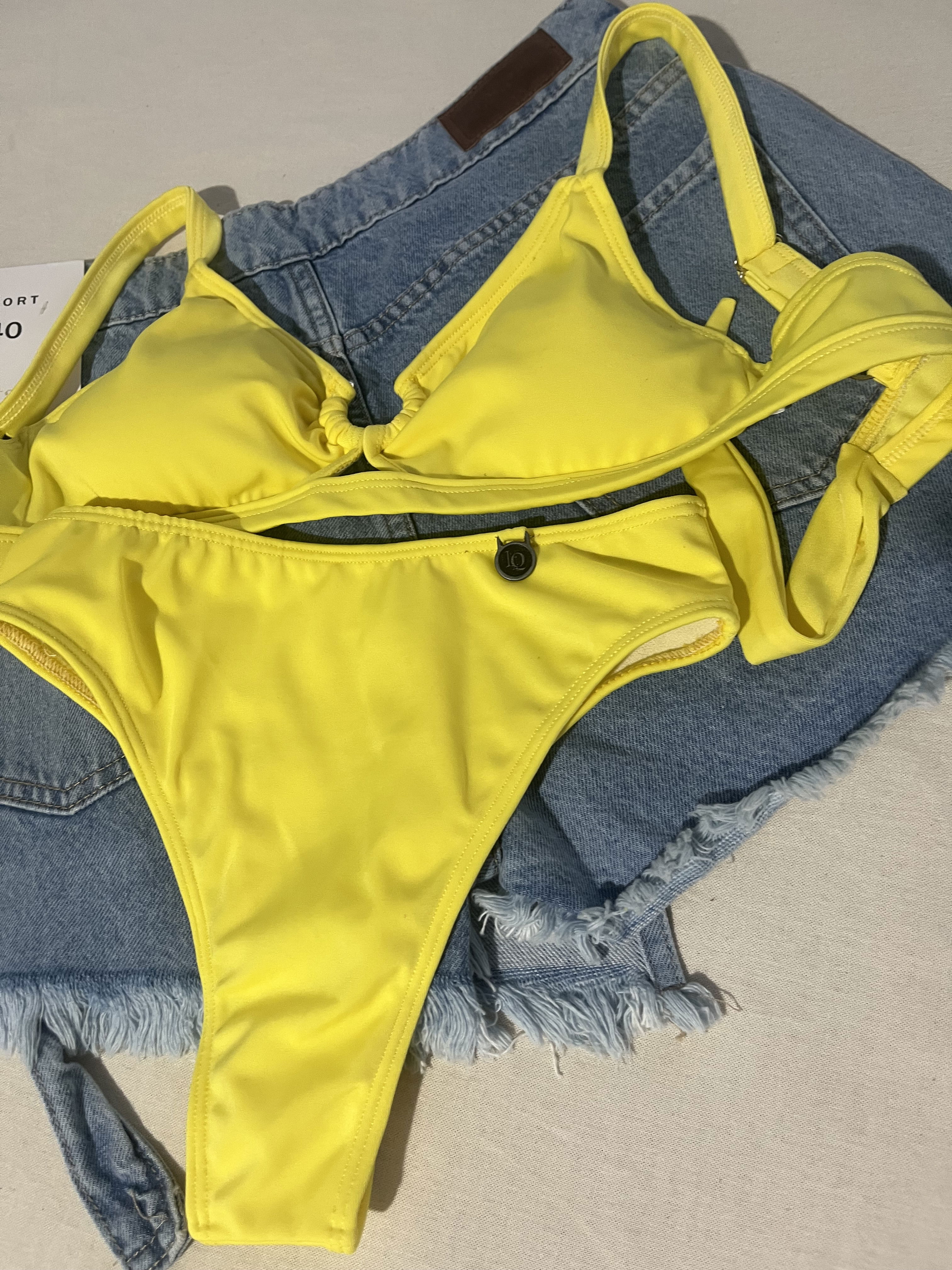 Corpiño top con herraje, de tricot, con breteles regulables y espalda para atar. Bombo colaless tiro alto