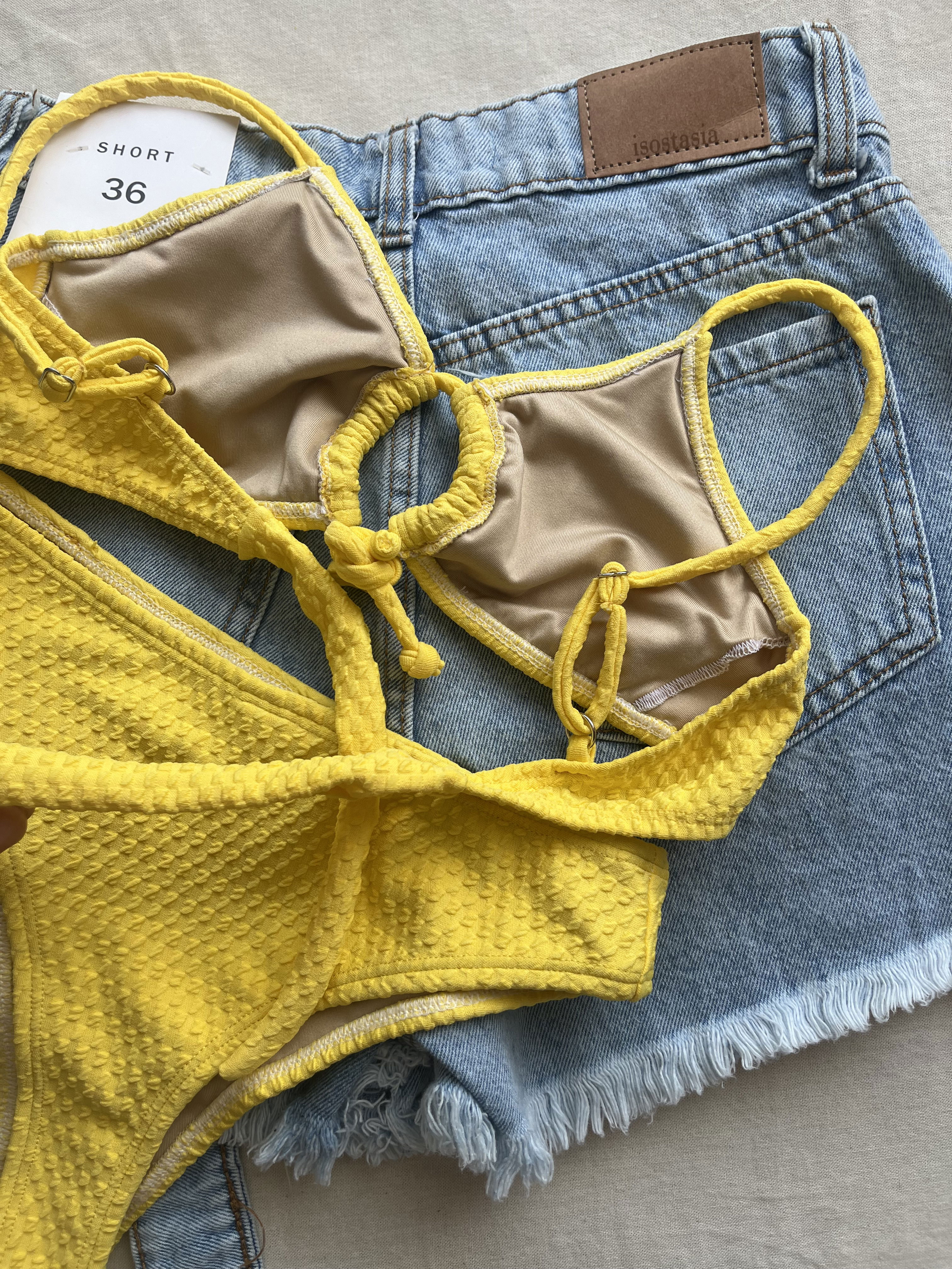 Triángulito con detalle de avío personalizado en medio , corpi con abertura para agregar tazas y bombi colaless con tiras para atar.