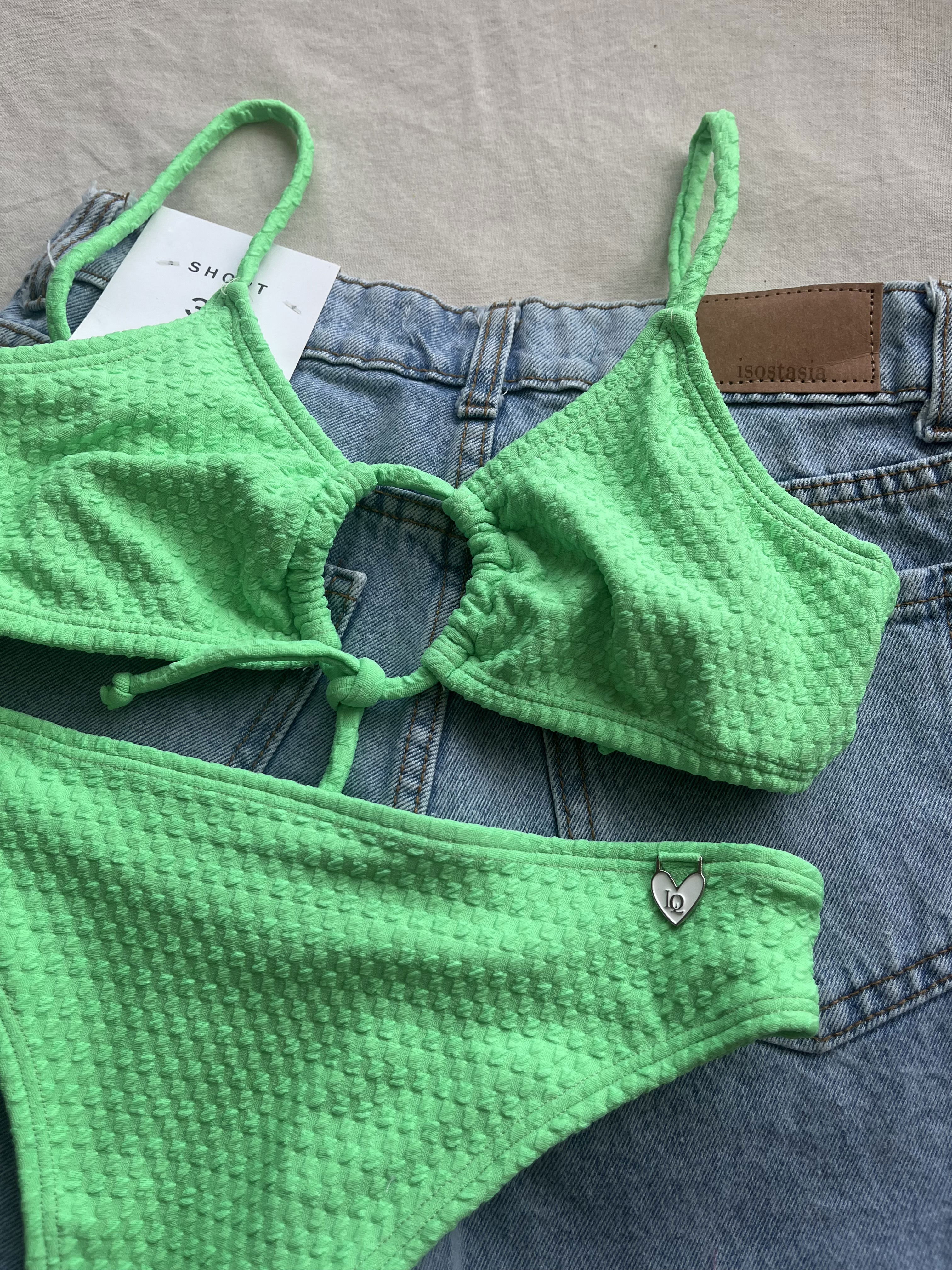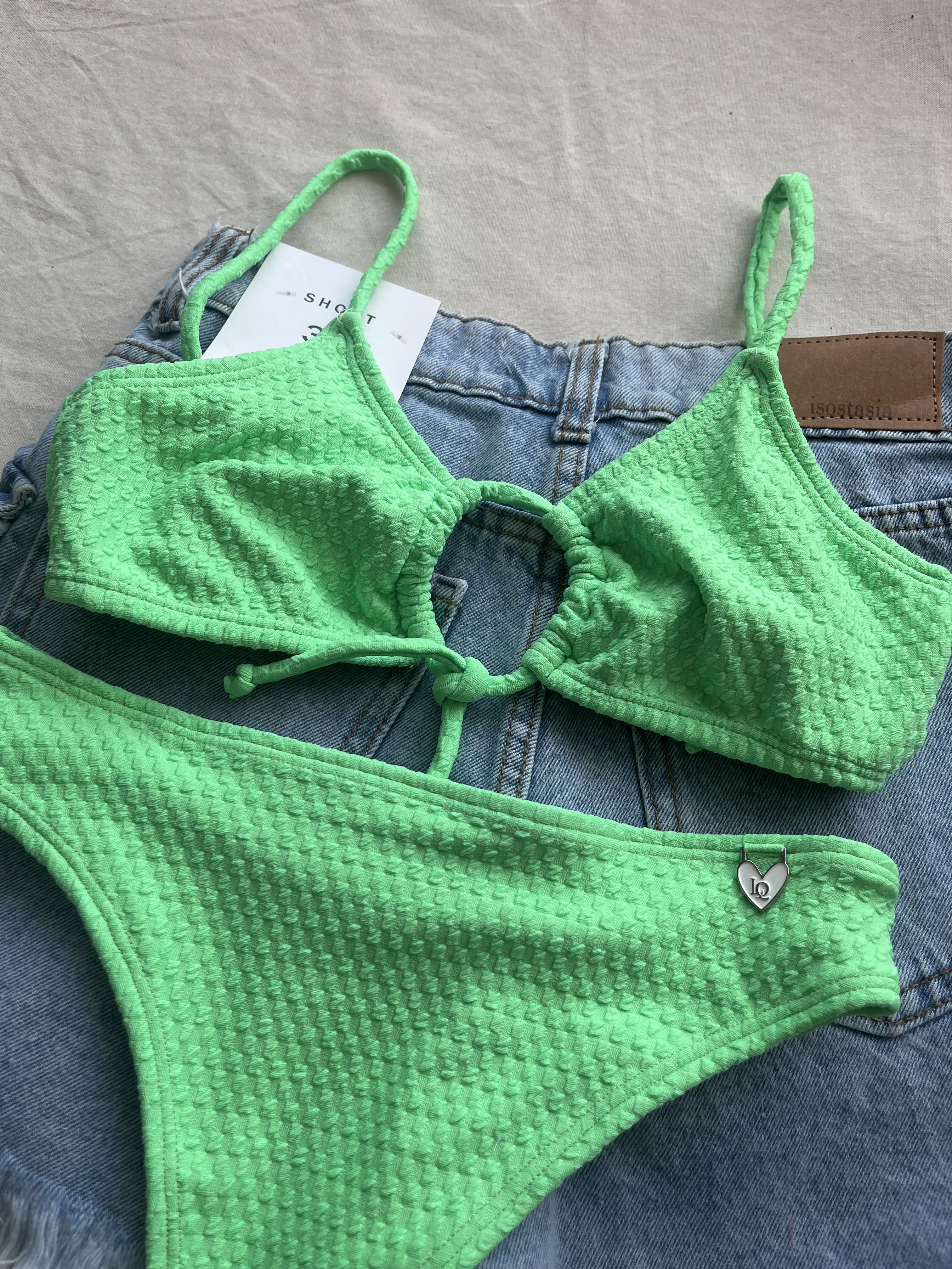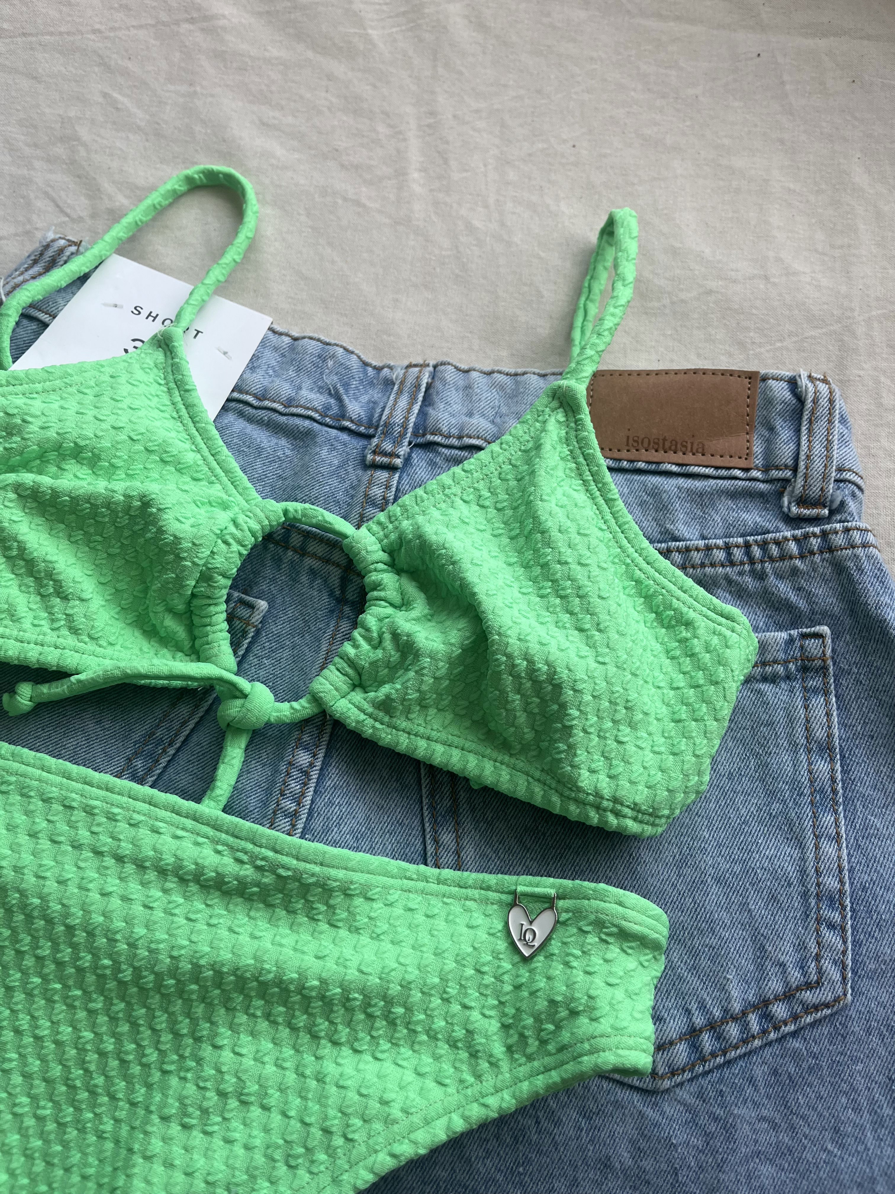 Triángulito con detalle de avío personalizado en medio , corpi con abertura para agregar tazas y bombi colaless con tiras para atar.