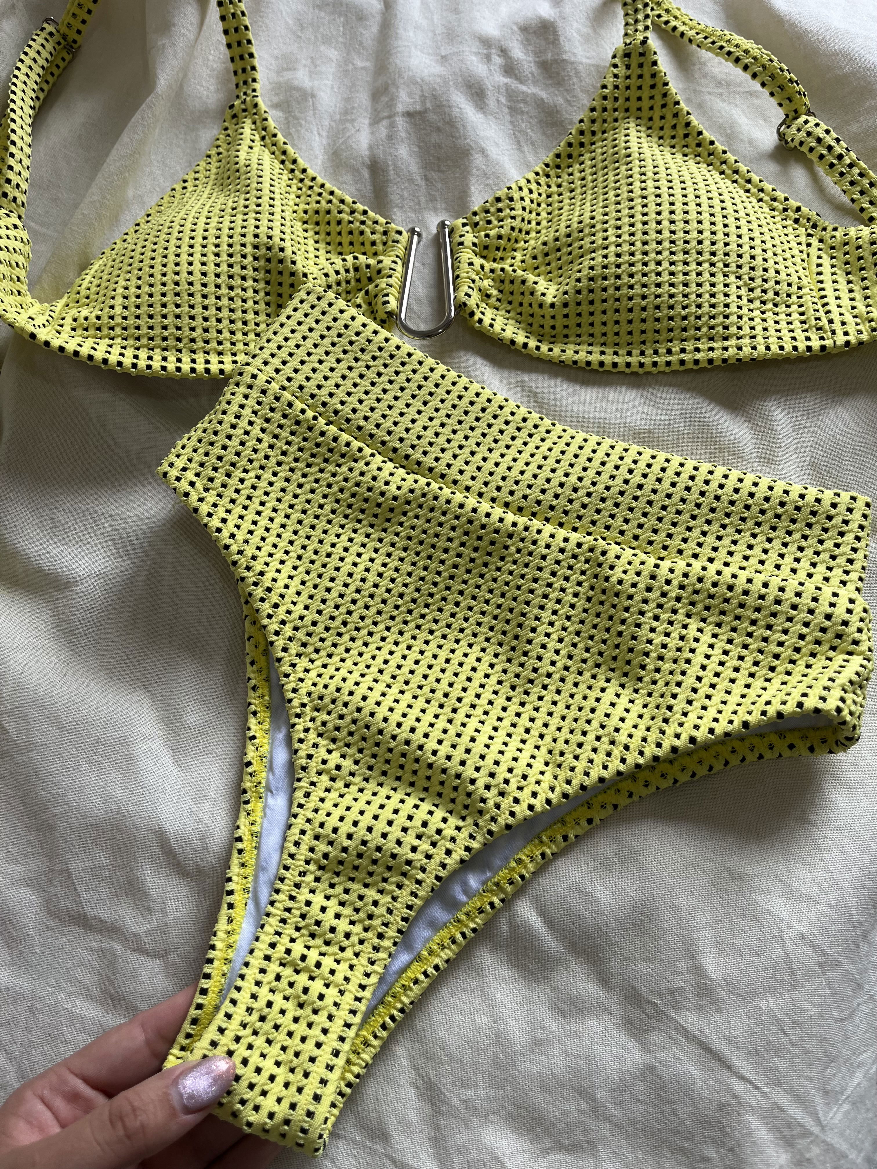 Top texturado con herraje, breteles regulables y espalda para atar.