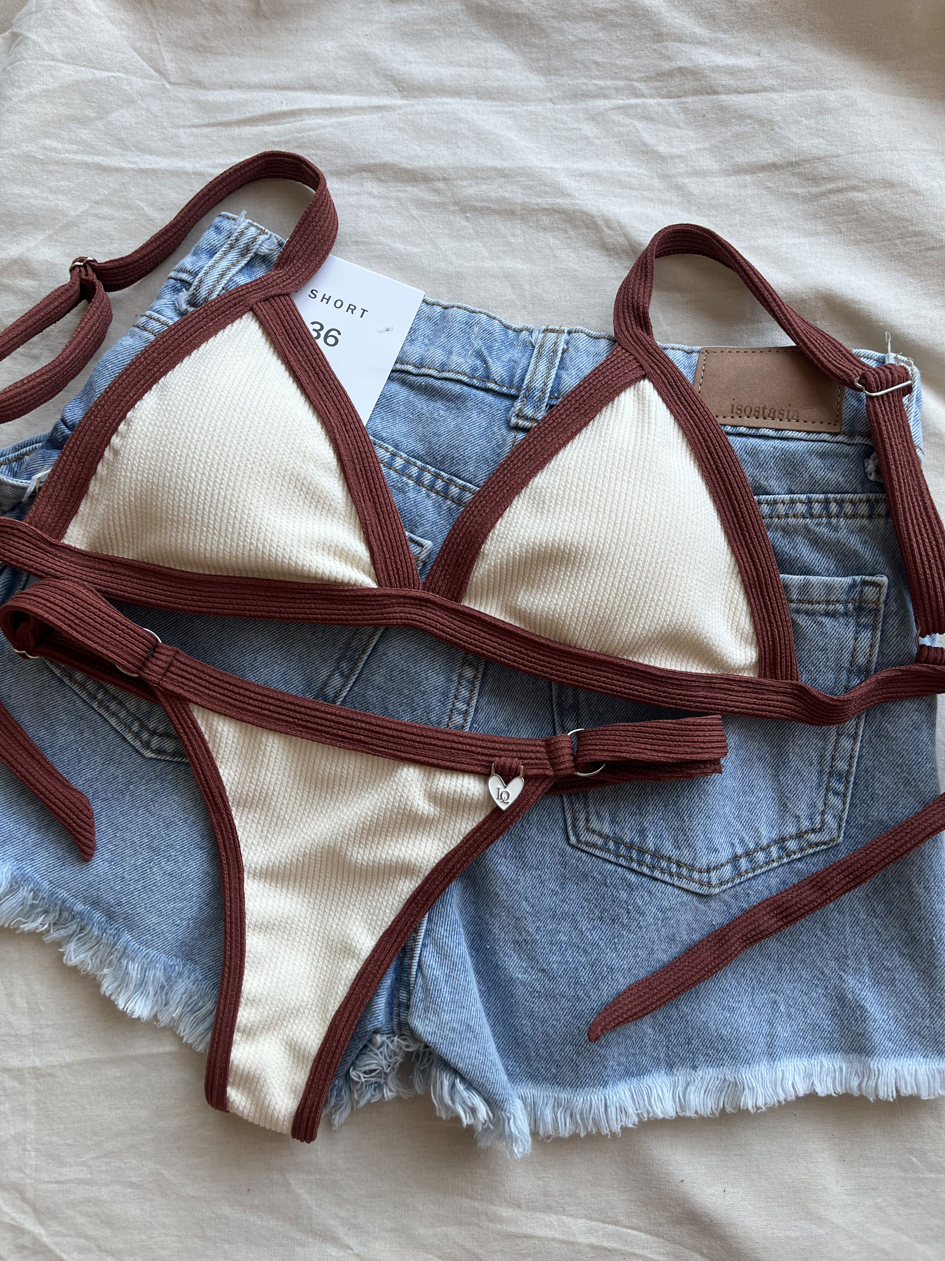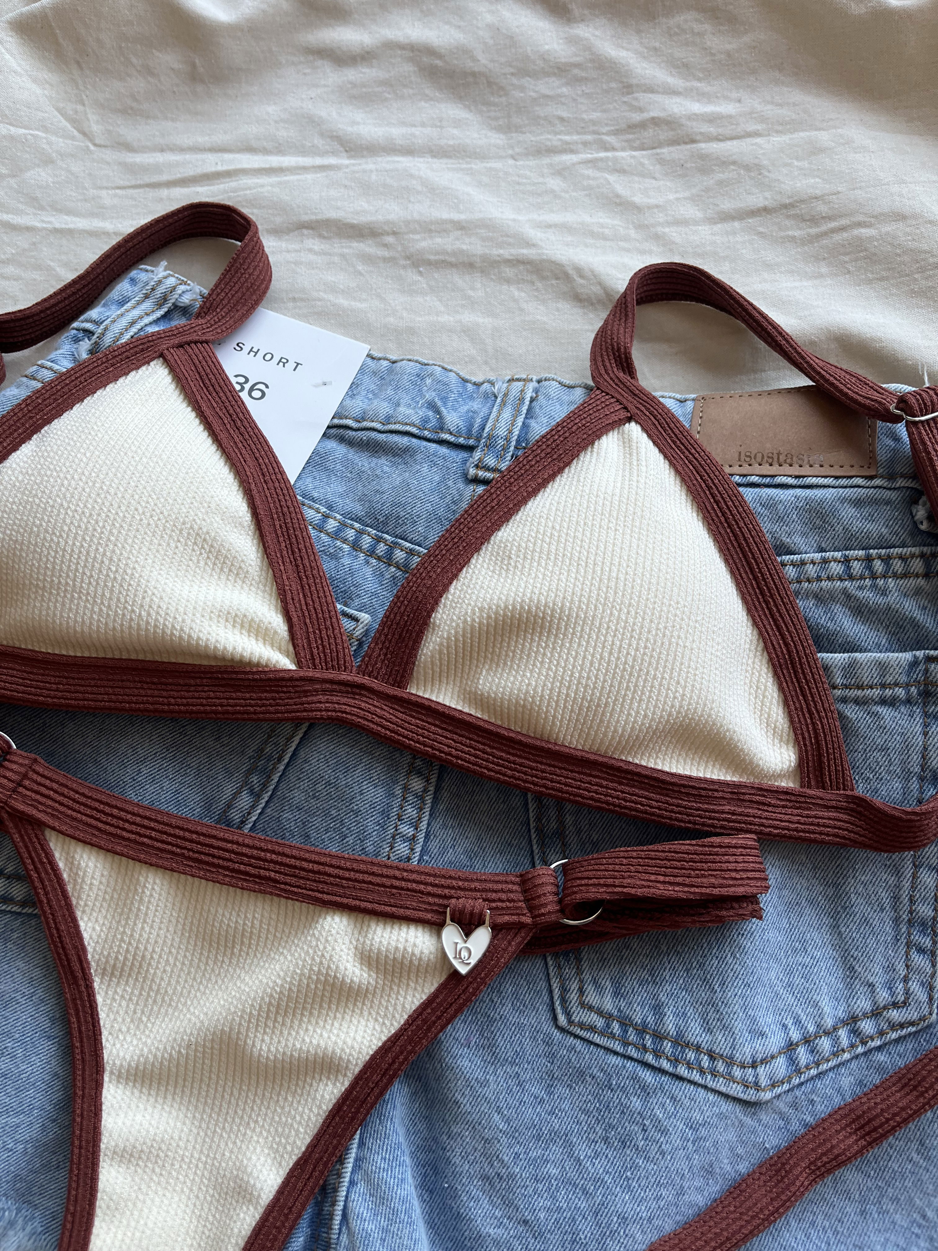 Triángulo texturado. Corpiño con breteles regulables y espalda para atar. Colaless regulable