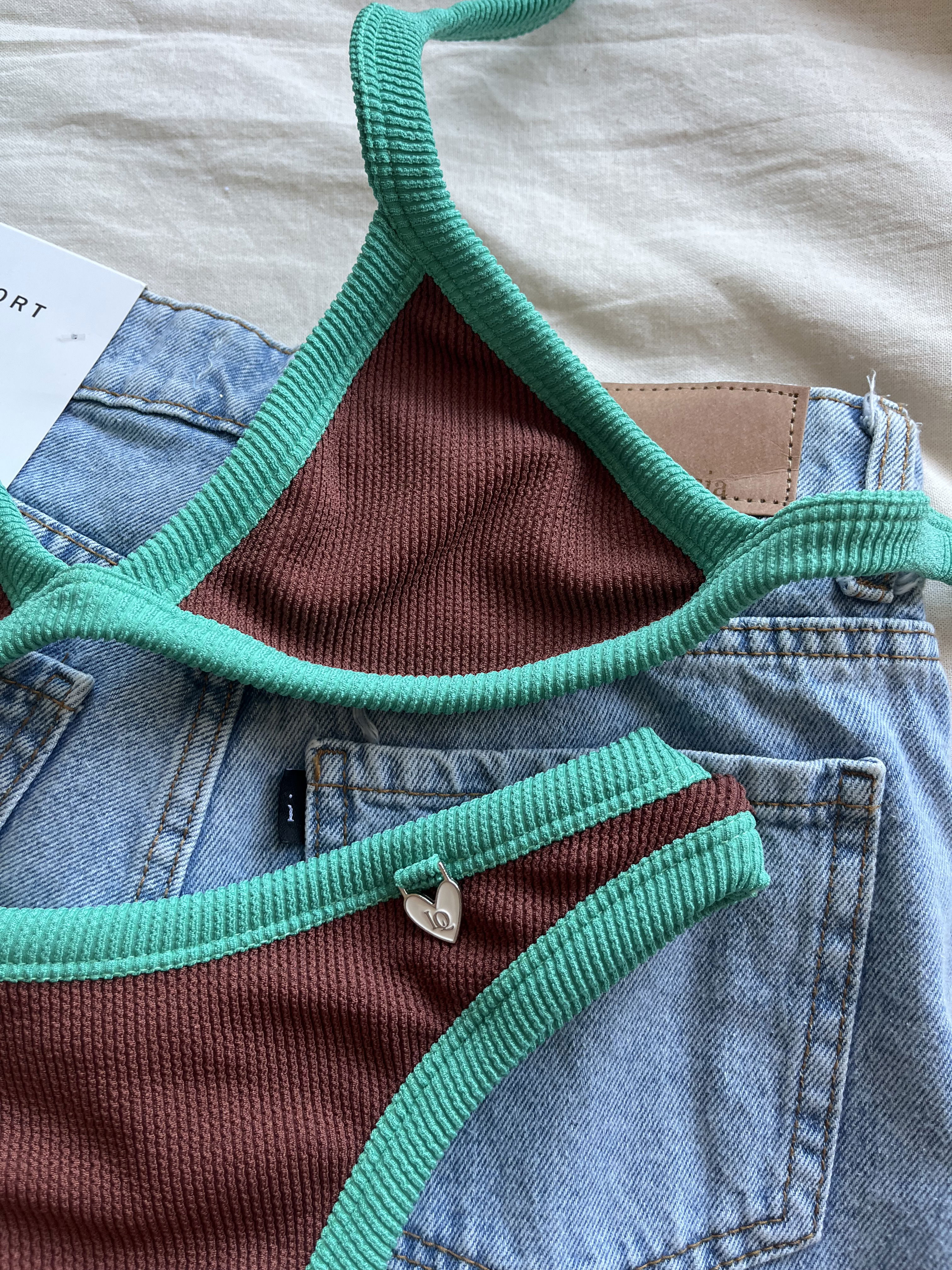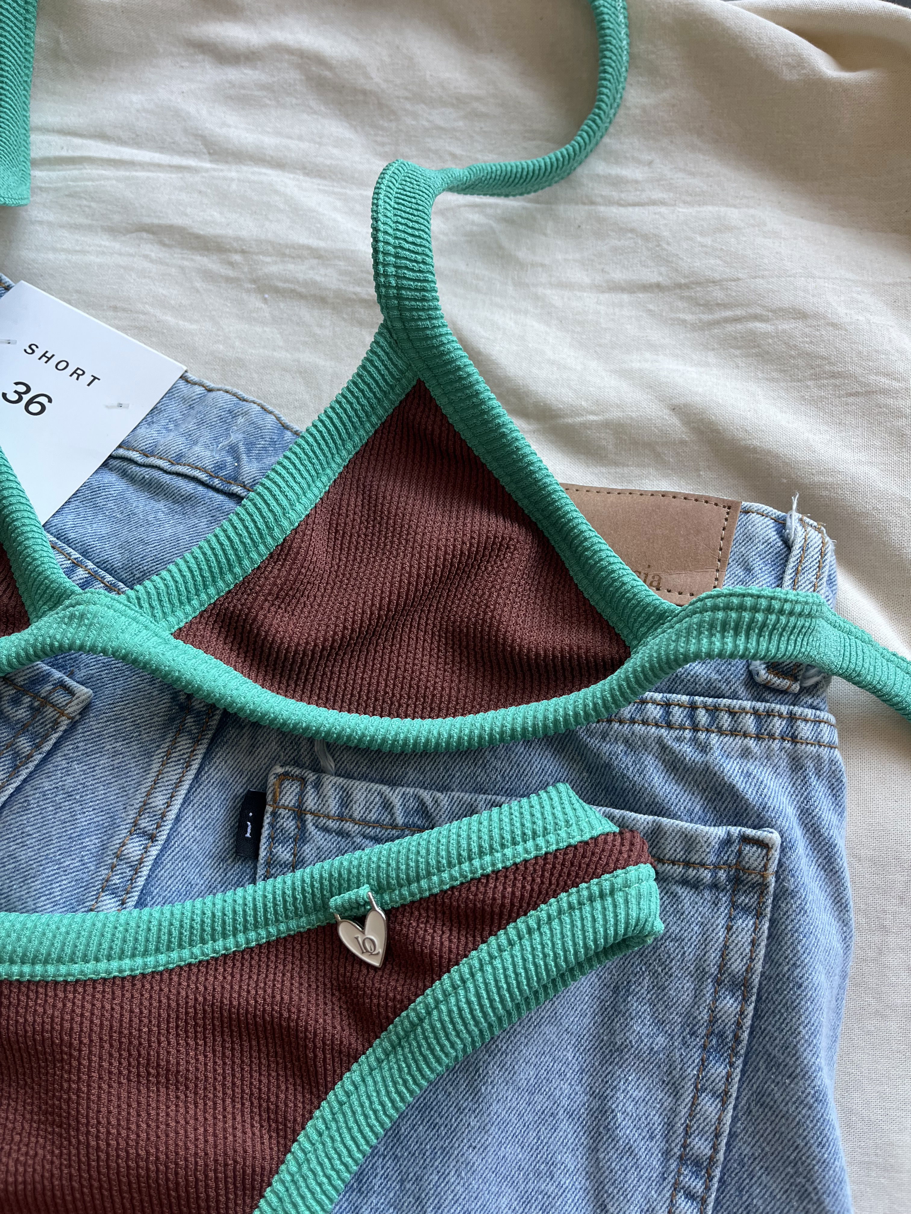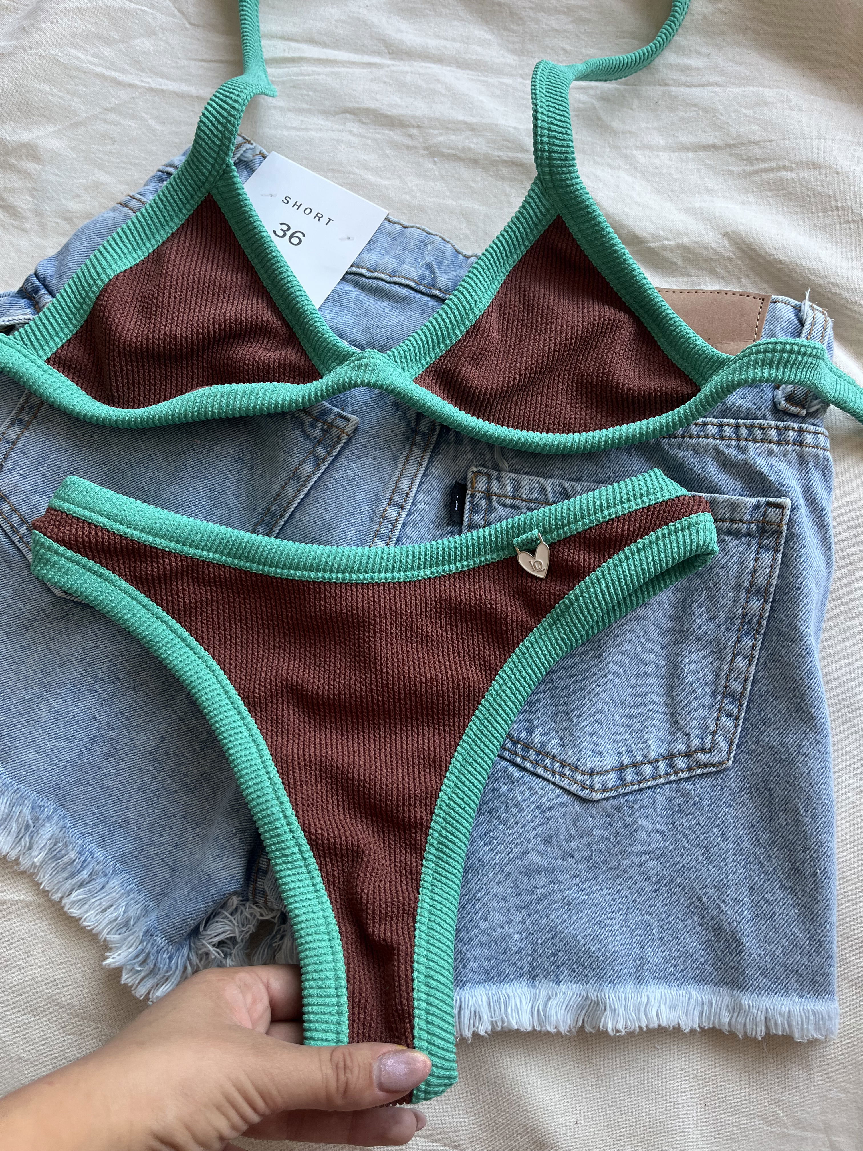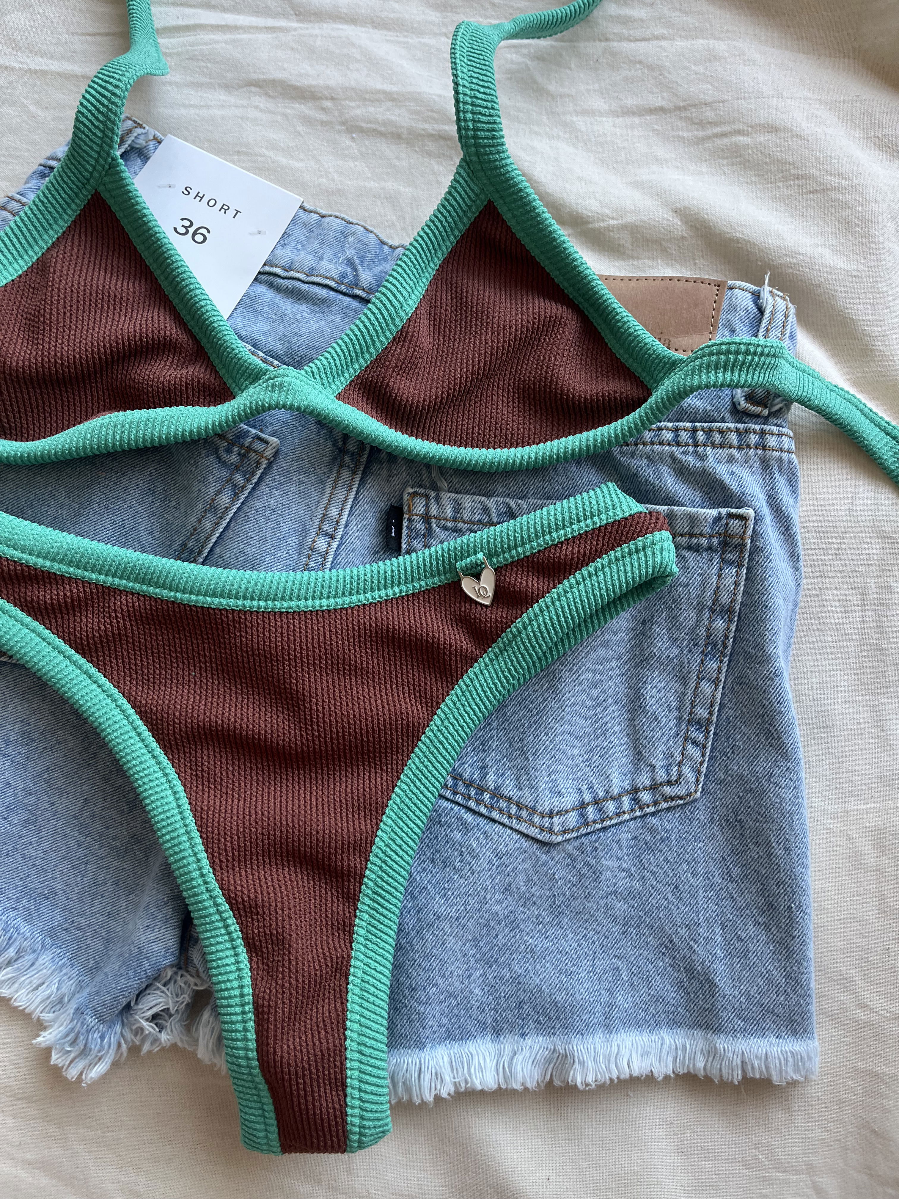 Triángulo con tiras para atar y colaless entera. El corpiño NO TRAE tazas desmontables pero TIENE ABERTURA PARA AGREGARLE.