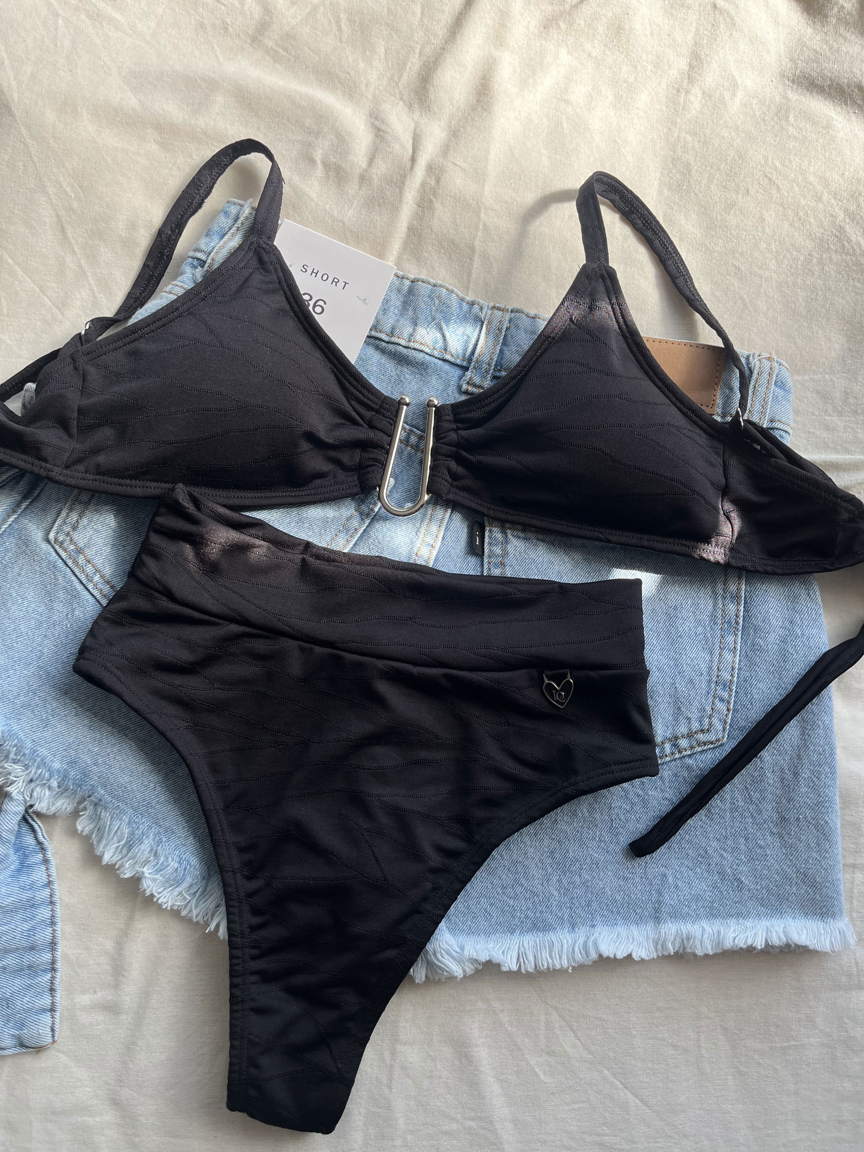 Top texturado con herraje, breteles regulables y espalda para atar.