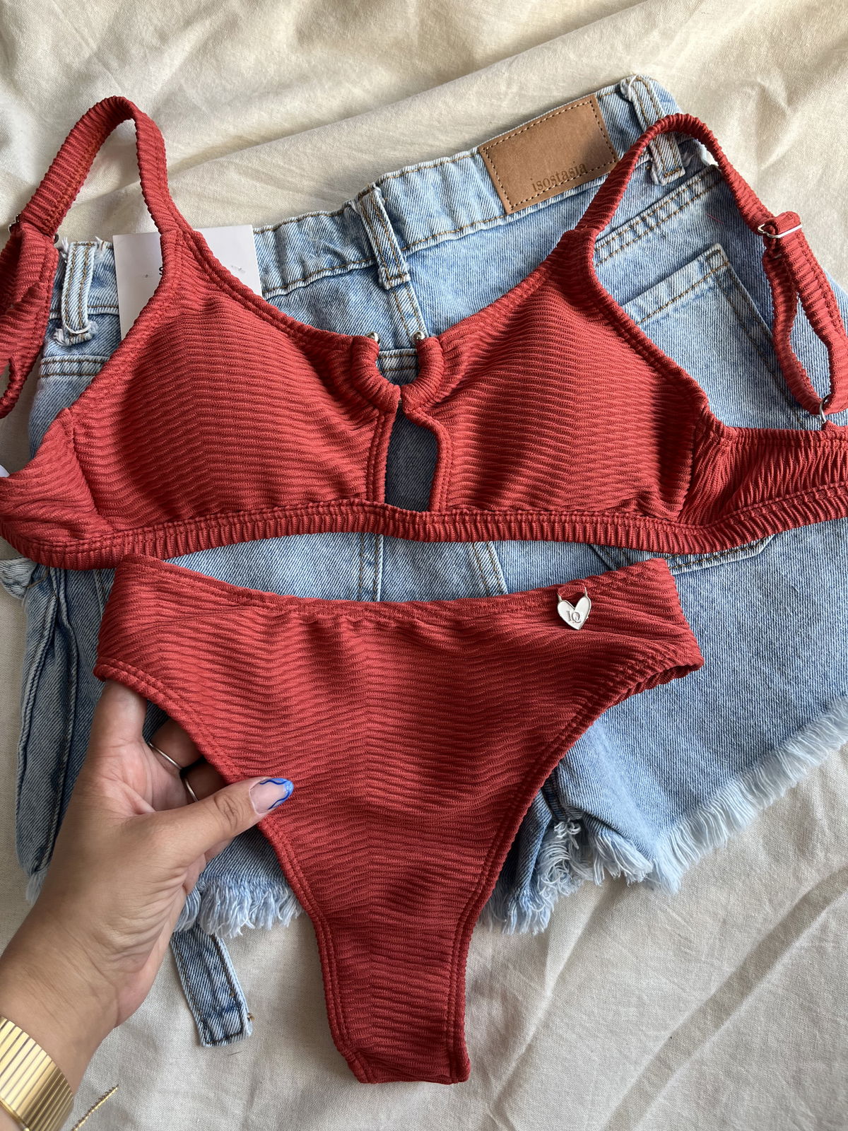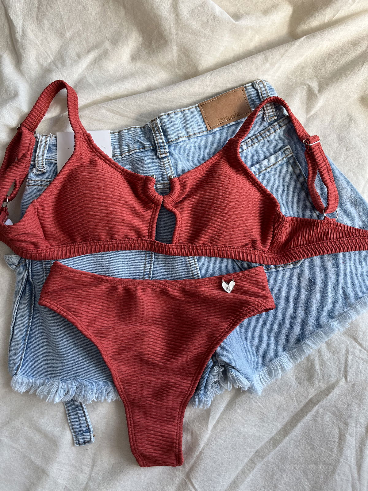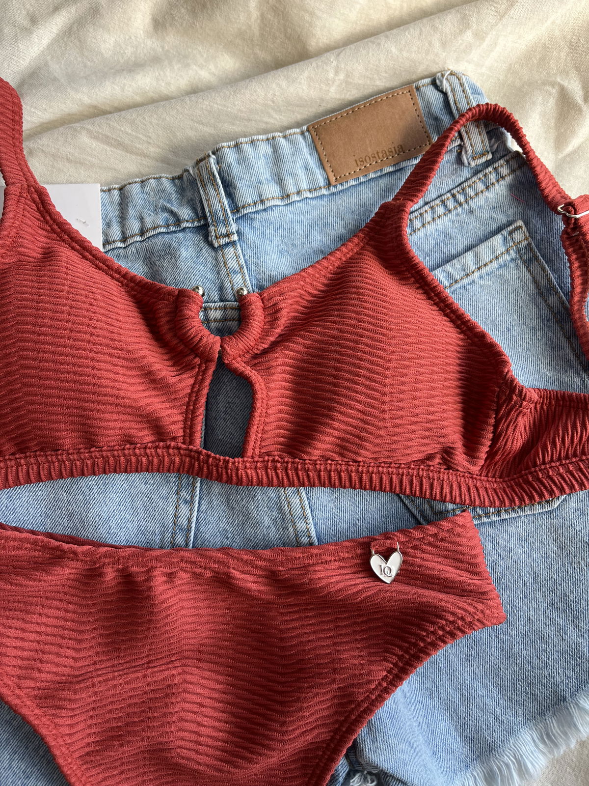 Top con herraje, breteles regulables y espalda para atar. Colaless tiro alto