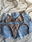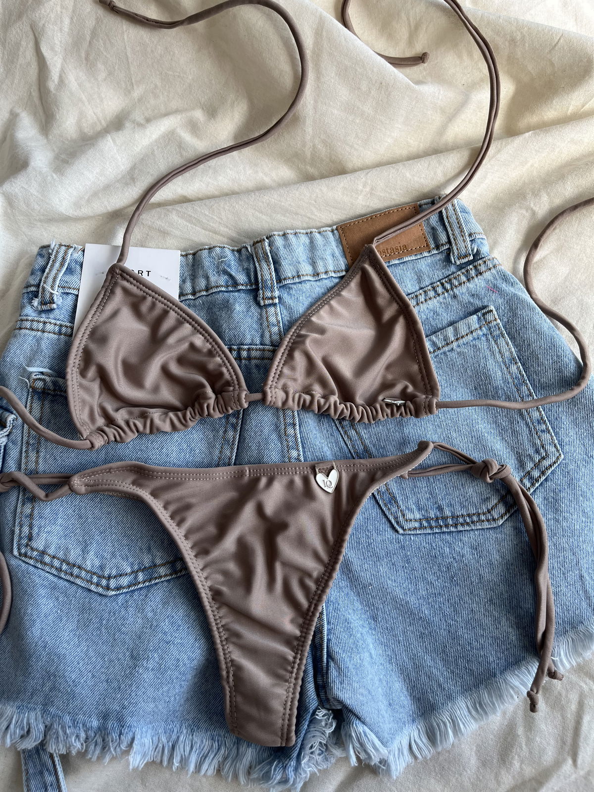 Triángulito en tricot y colaless con tiras para atar. Doble forreria y la abertura para agregarle rellenitos.