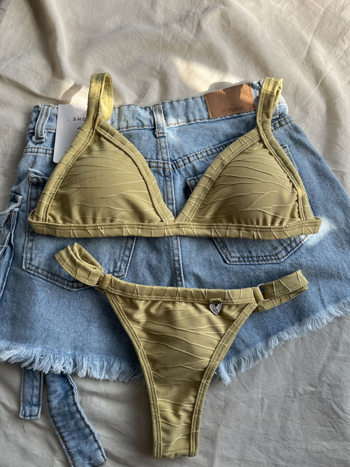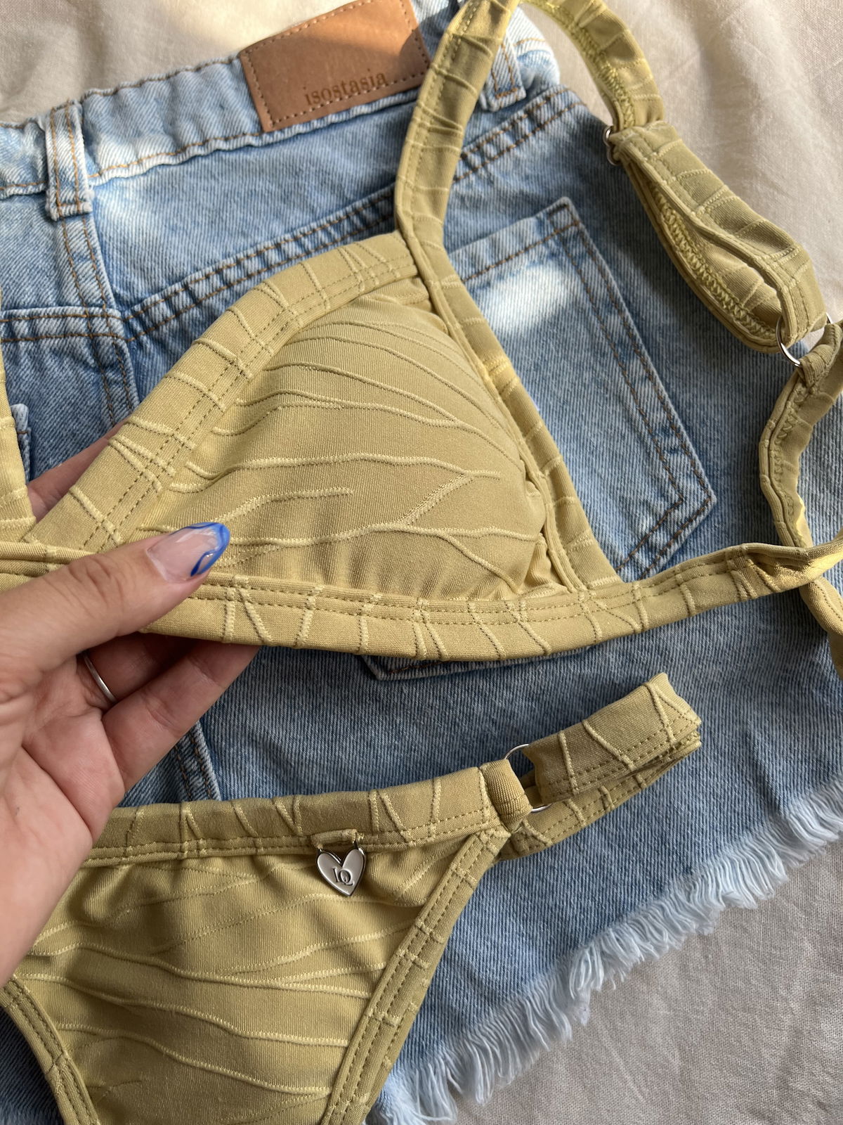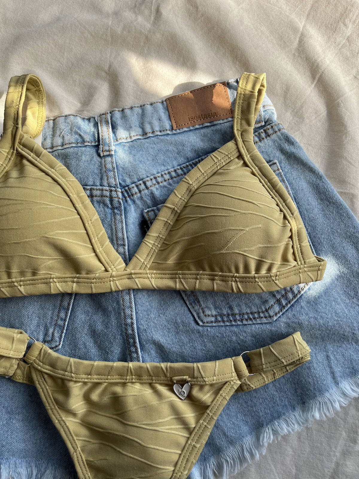 Triángulo texturado. Corpiño con breteles regulables y espalda para atar. Colaless regulable