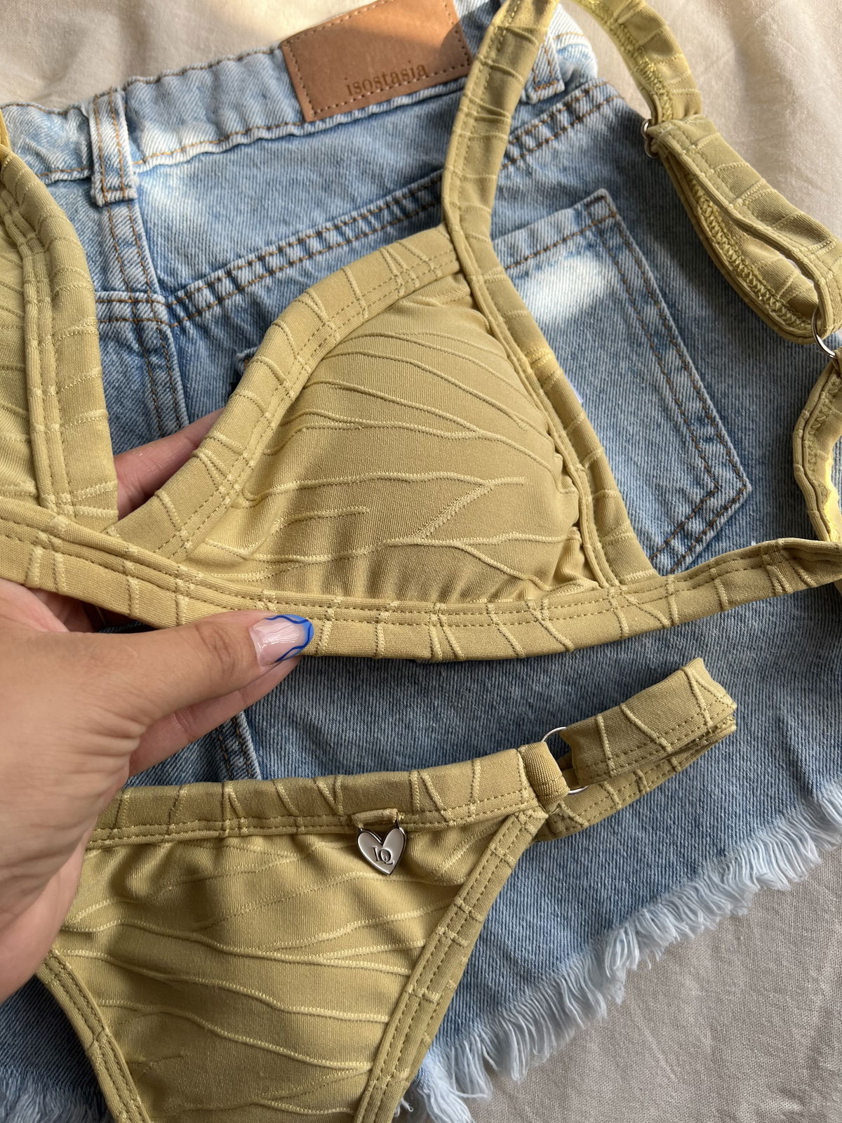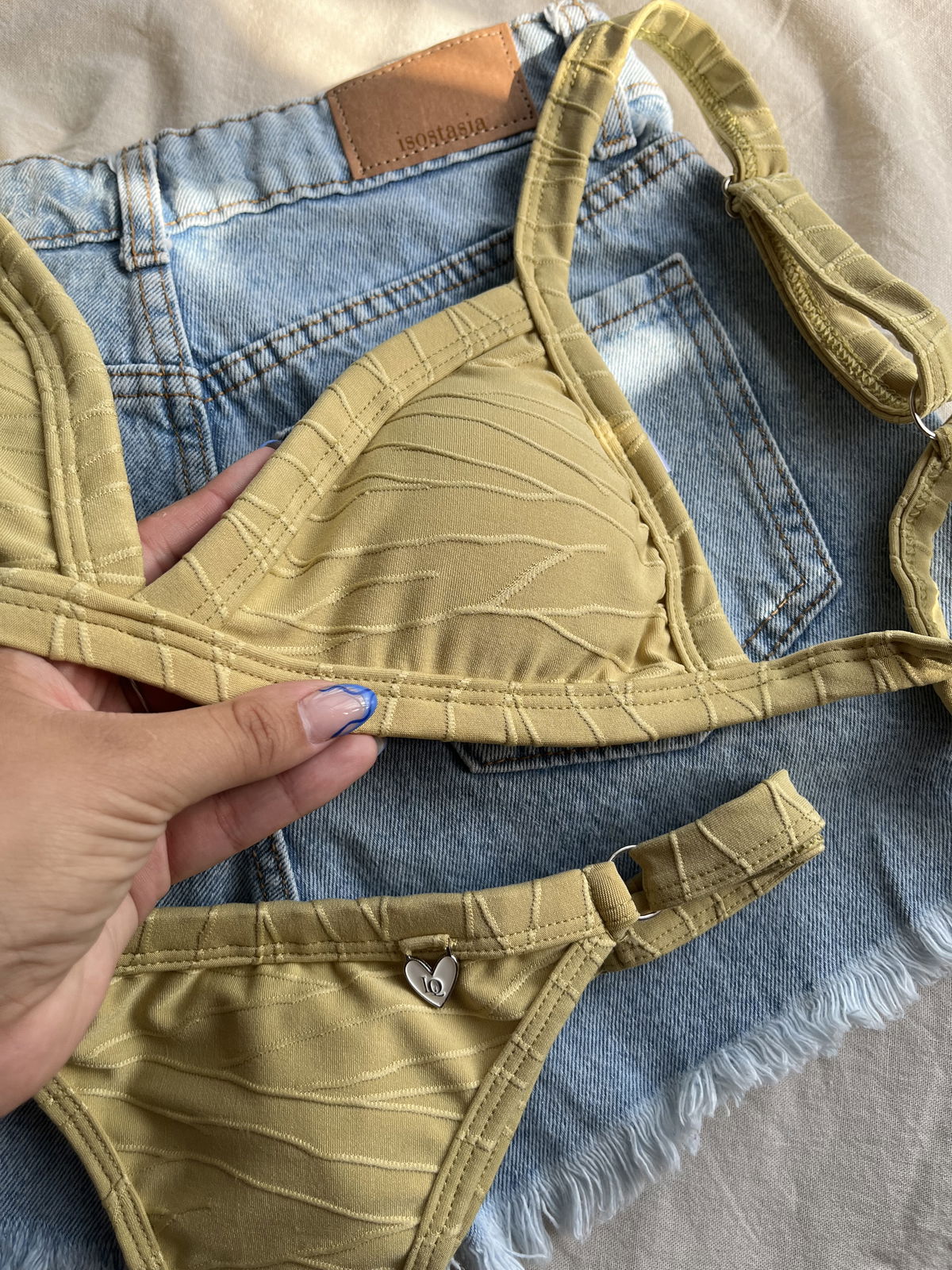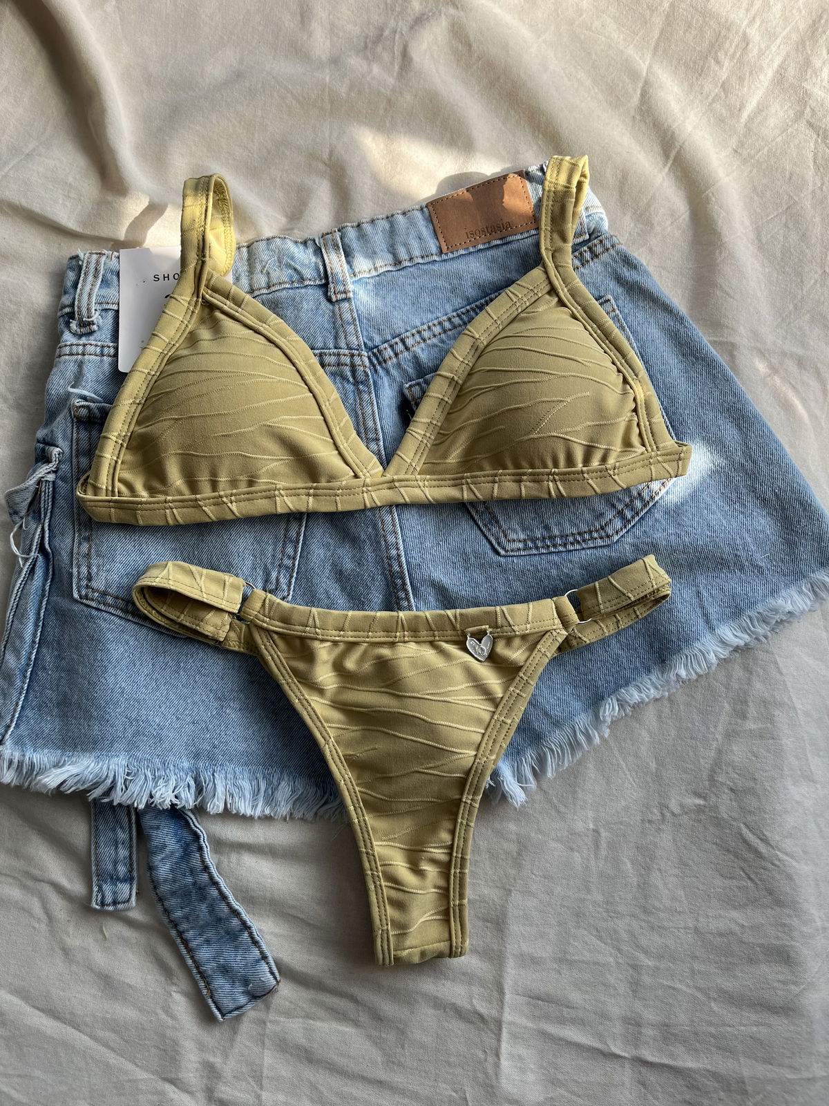 Triángulo texturado. Corpiño con breteles regulables y espalda para atar. Colaless regulable