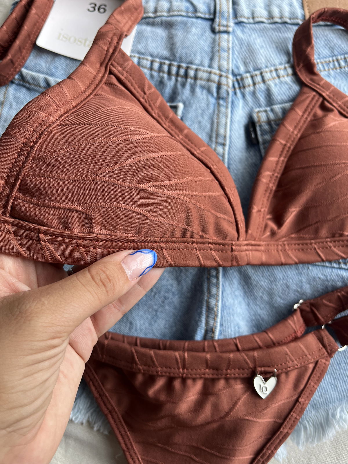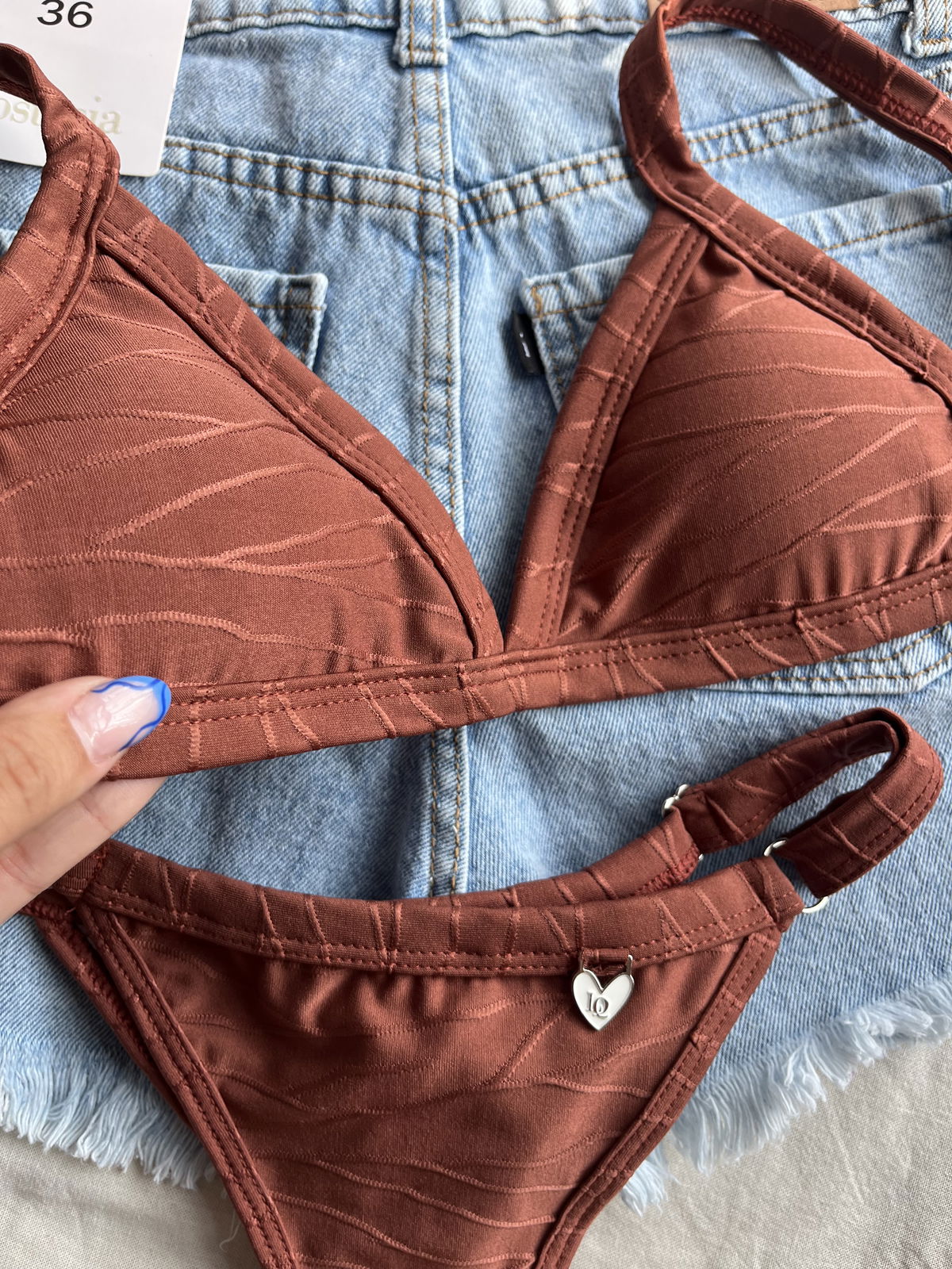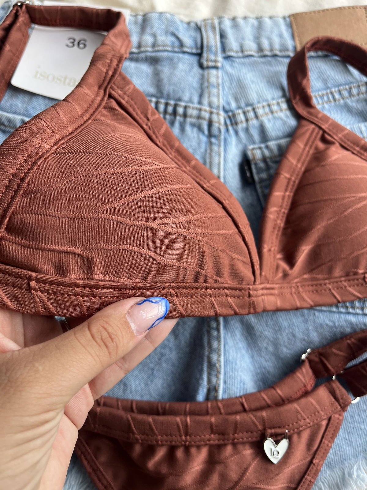 Triángulo texturado. Corpiño con breteles regulables y espalda para atar. Colaless regulable