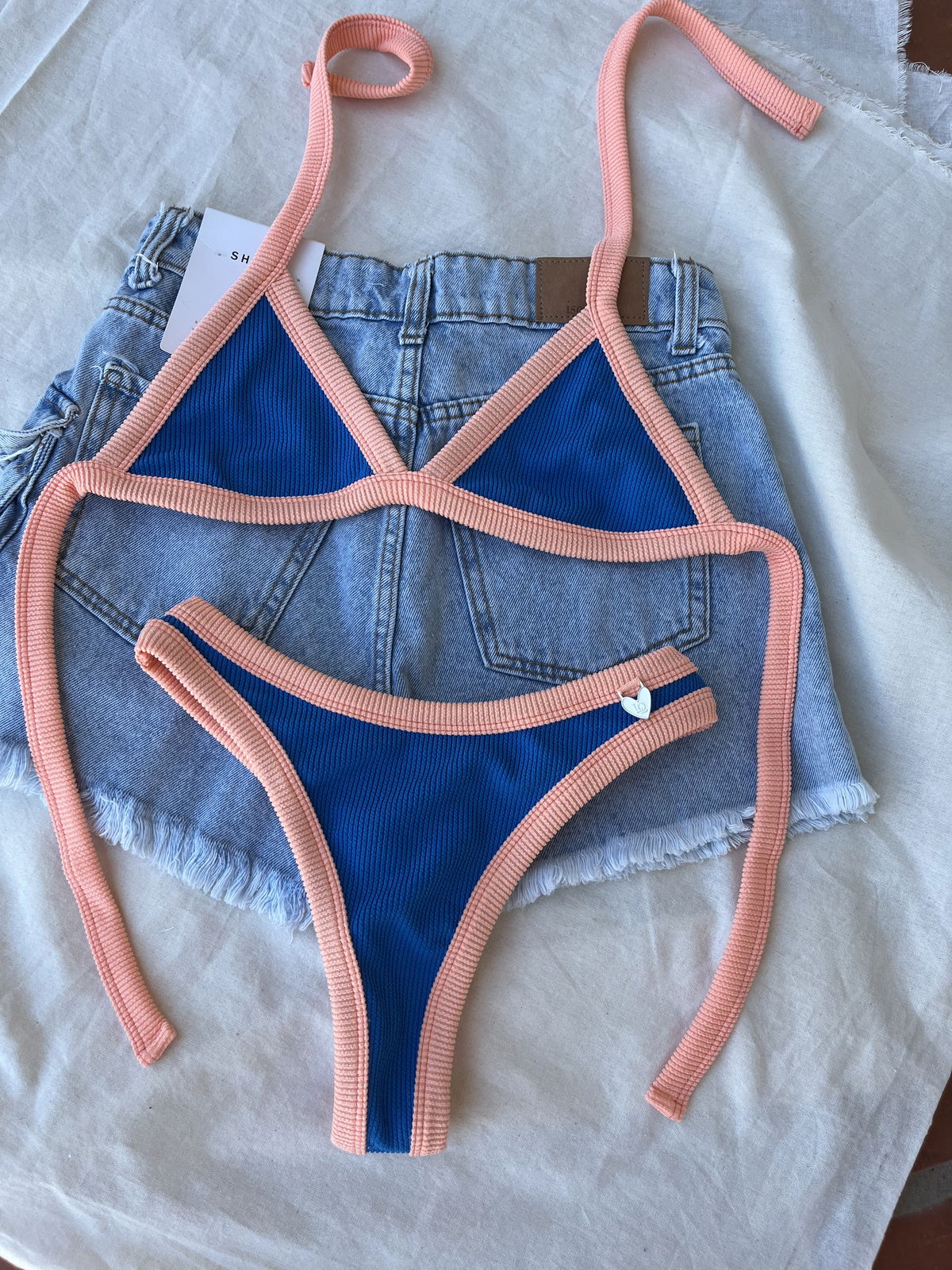 Triángulo con tiras para atar y colaless entera. El corpiño NO TRAE tazas desmontables pero TIENE ABERTURA PARA AGREGARLE.