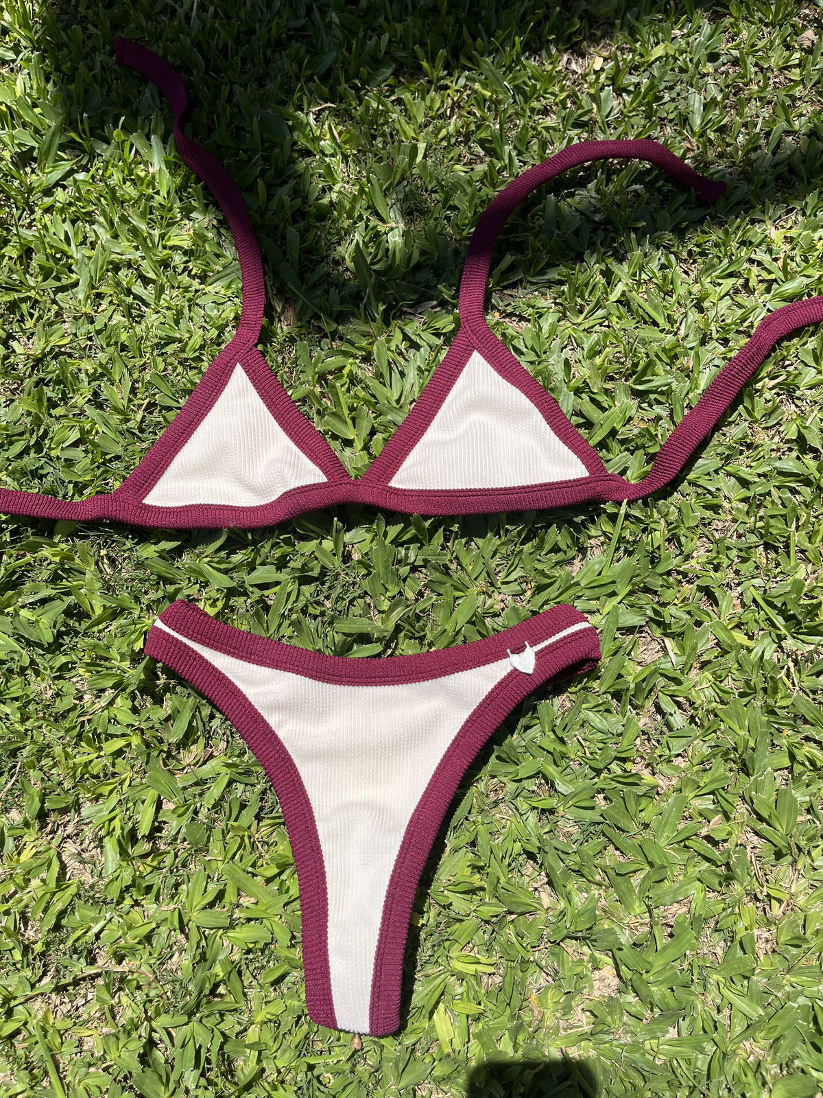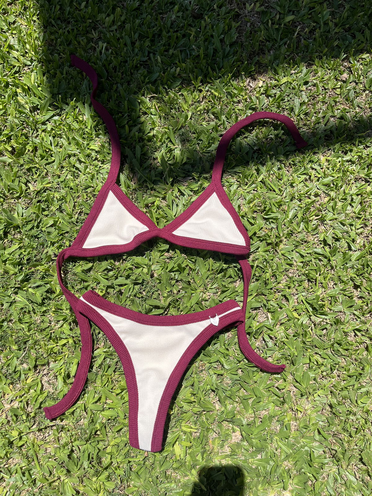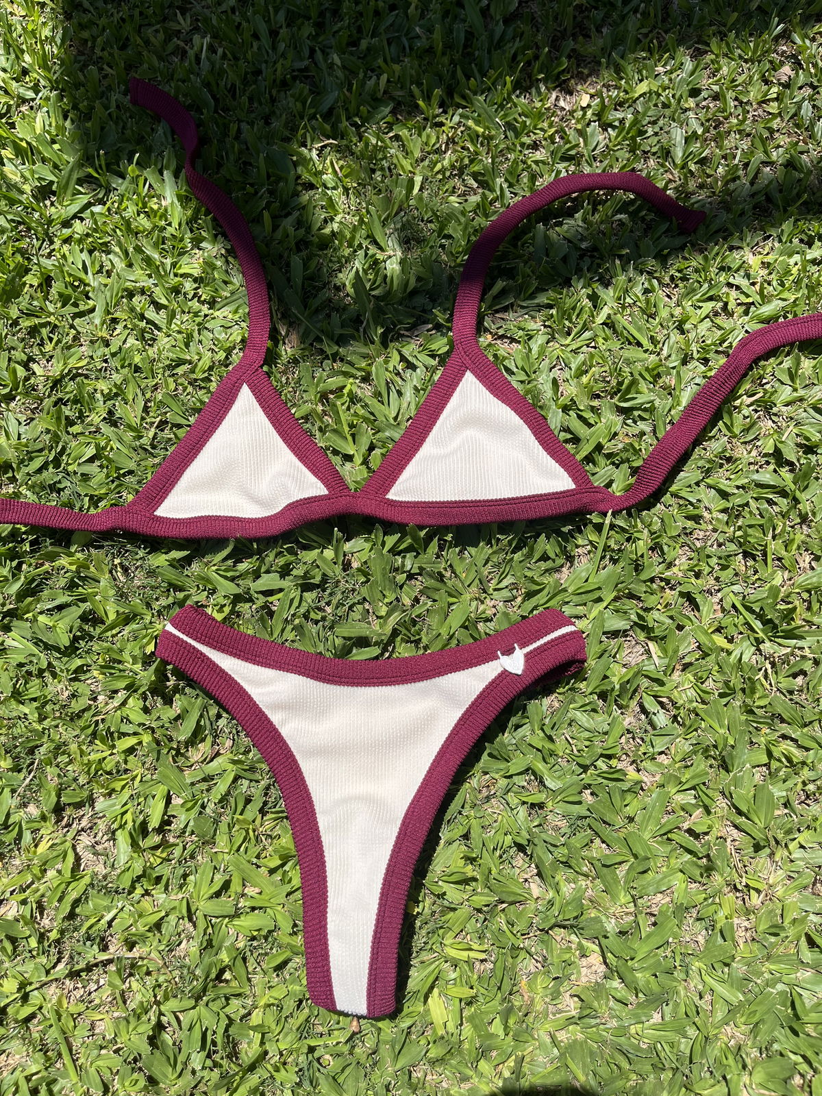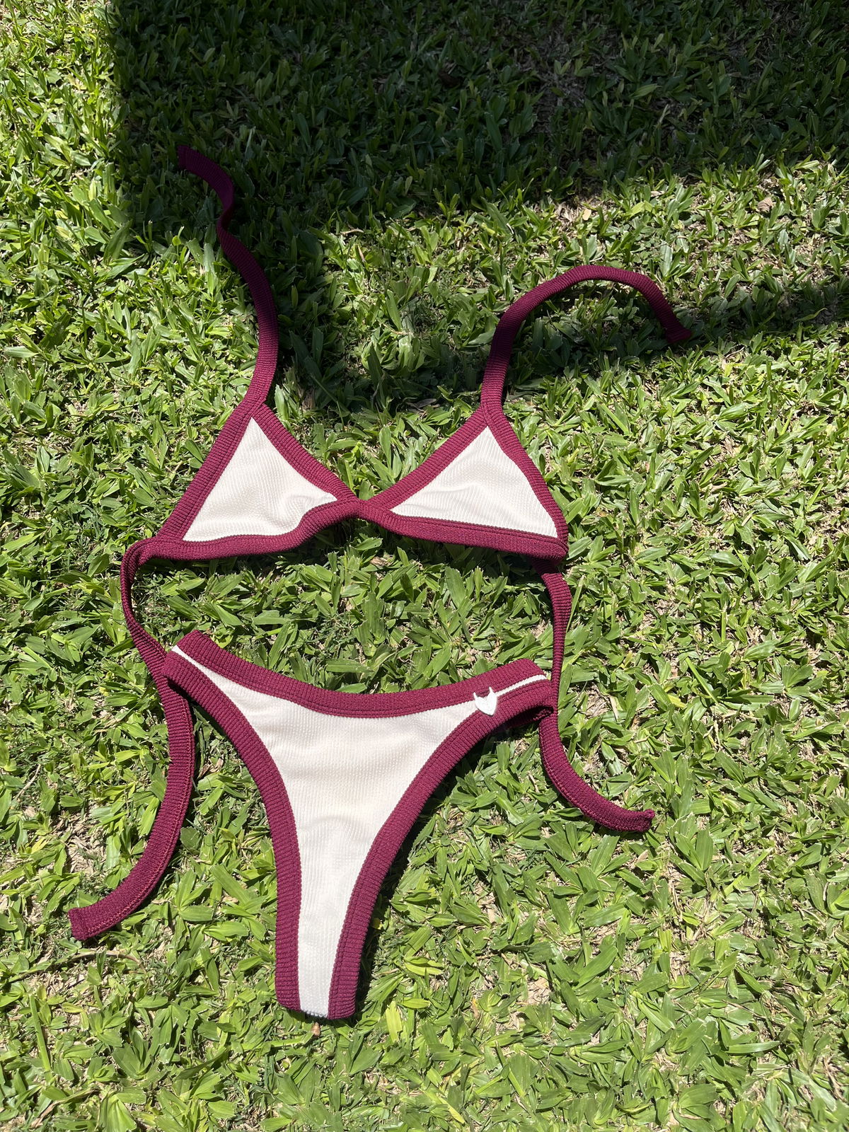 Triángulo con tiras para atar y colaless entera. El corpiño NO TRAE tazas desmontables pero TIENE ABERTURA PARA AGREGARLE.