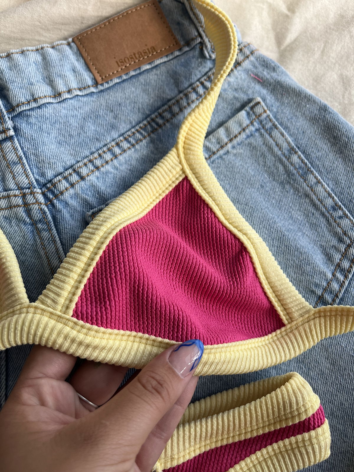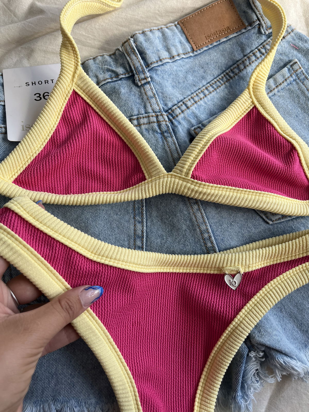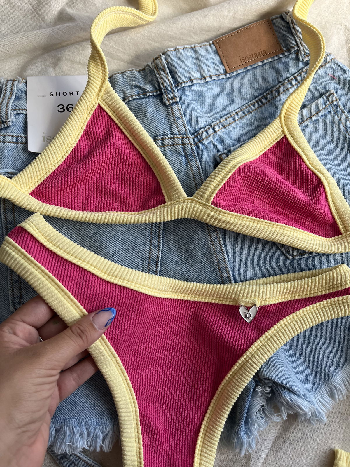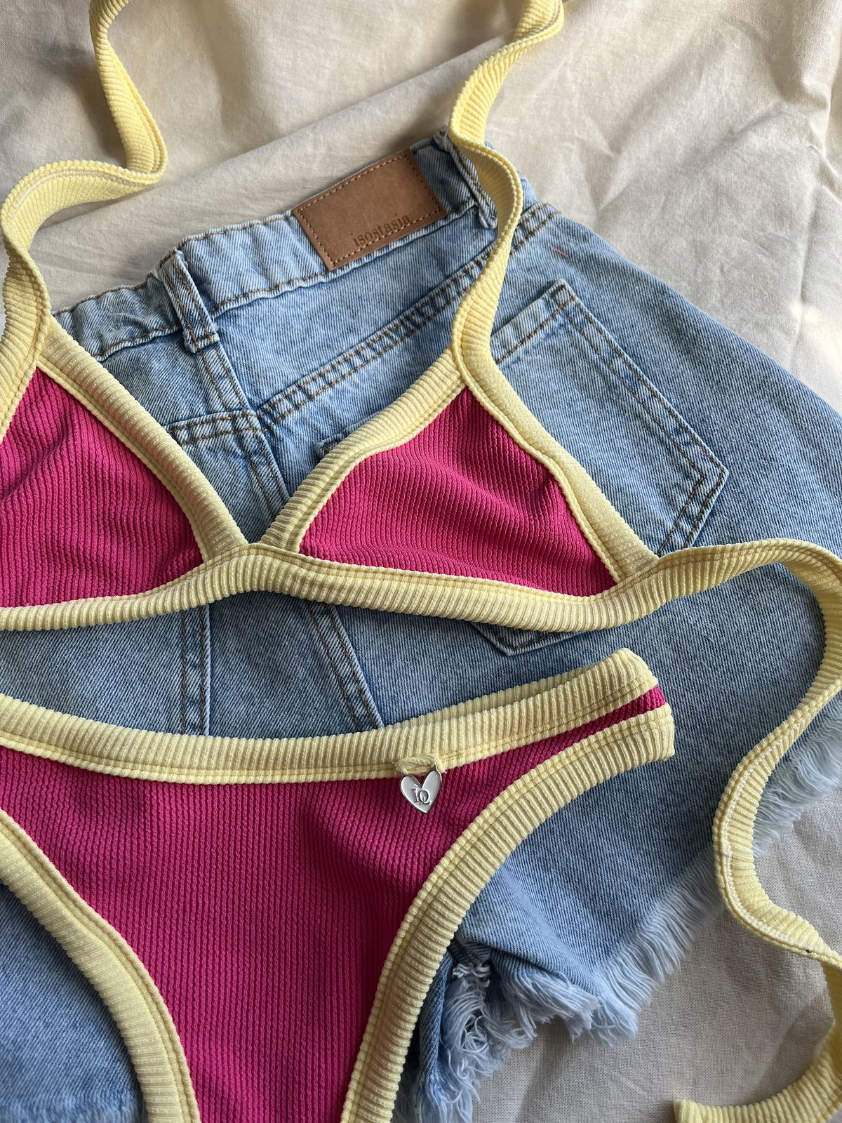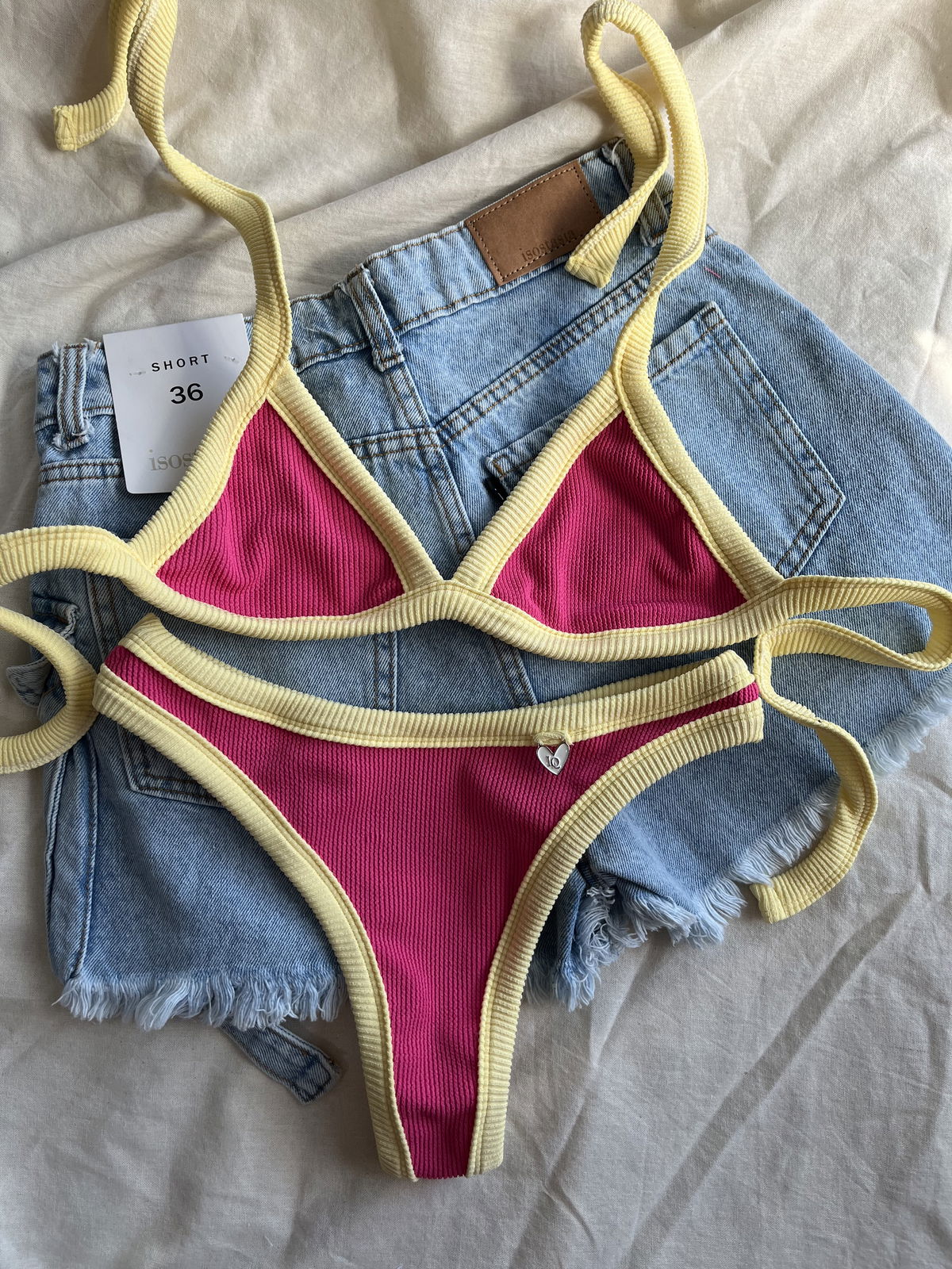 Triángulo con tiras para atar y colaless entera. El corpiño NO TRAE tazas desmontables pero TIENE ABERTURA PARA AGREGARLE.