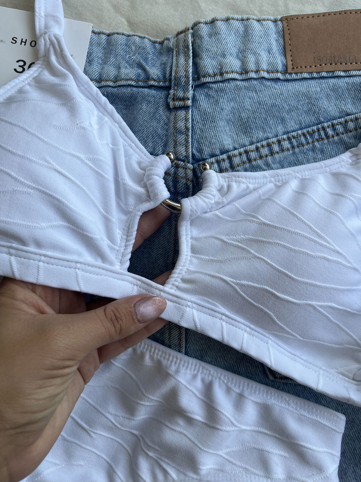 Top con herraje, breteles regulables y espalda para atar. Colaless tiro alto
