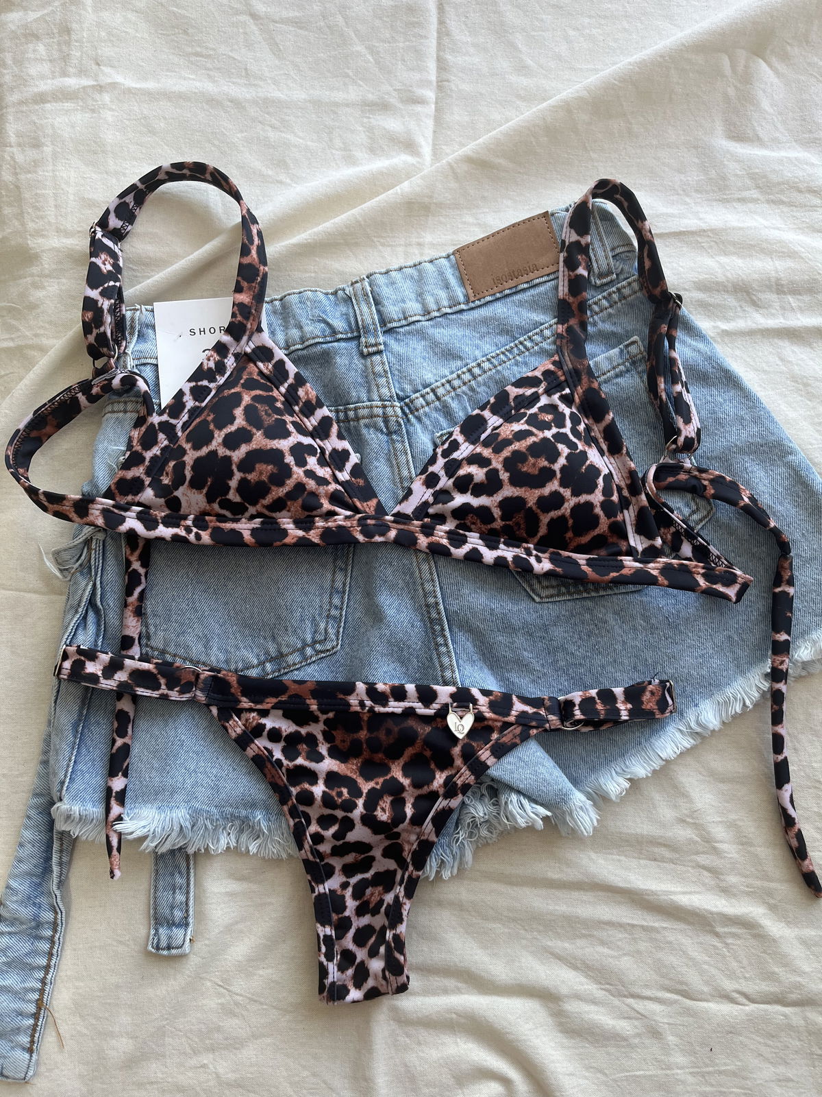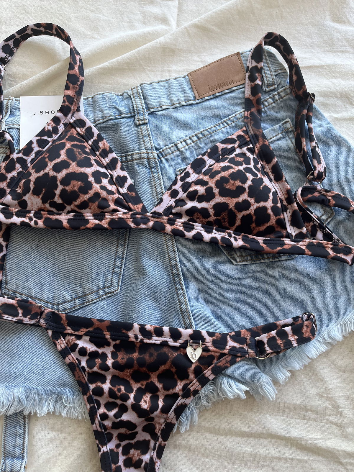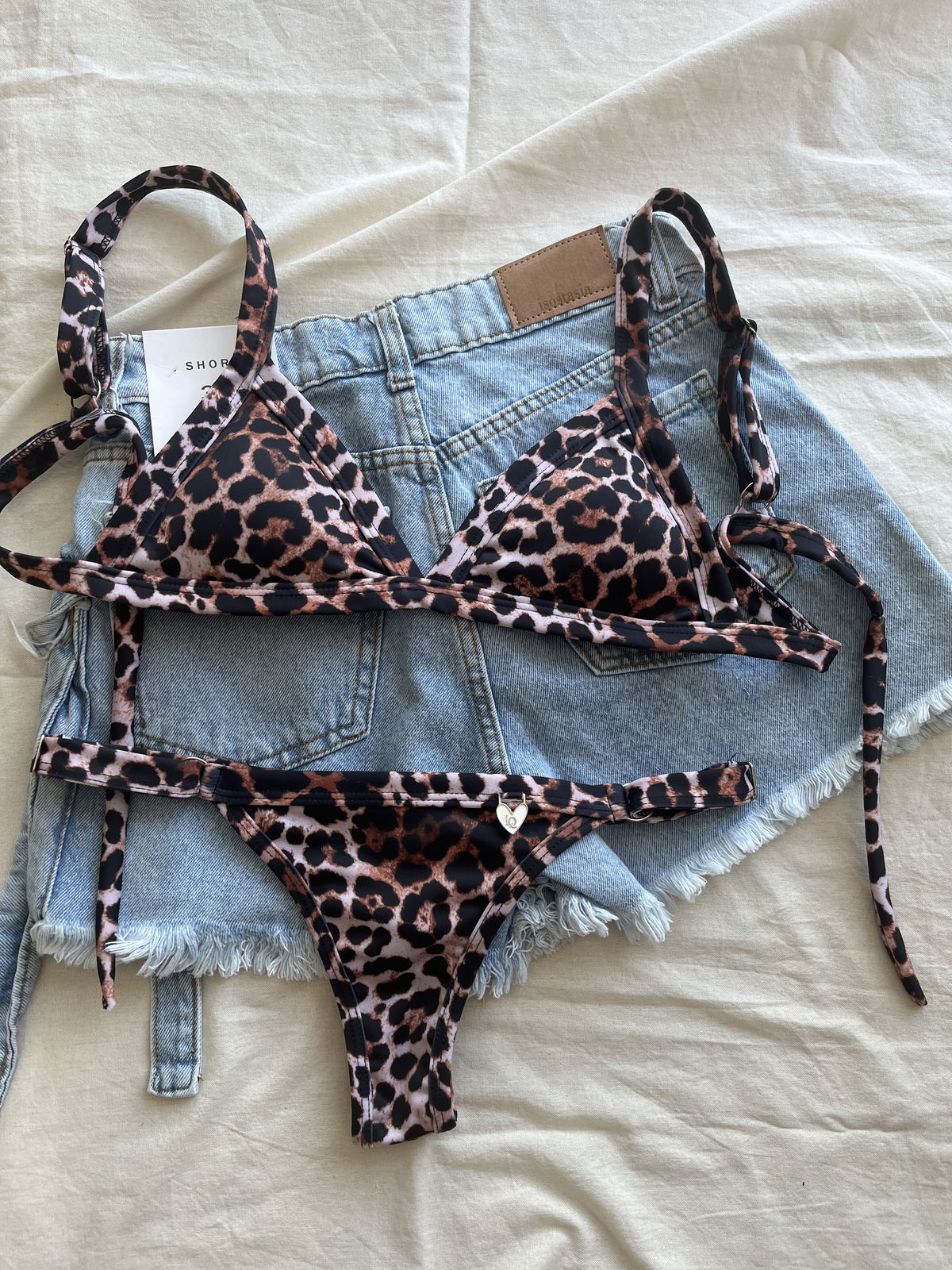 Triángulo lycra tricot con estampada exclusiva. Corpiño con breteles regulables y espalda para atar. Colaless regulable