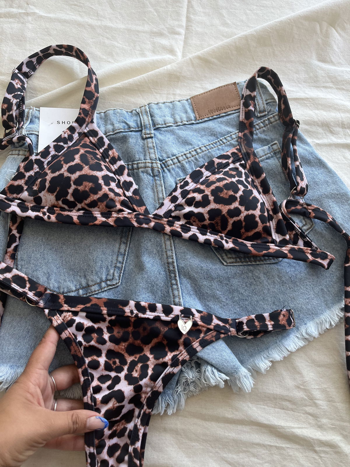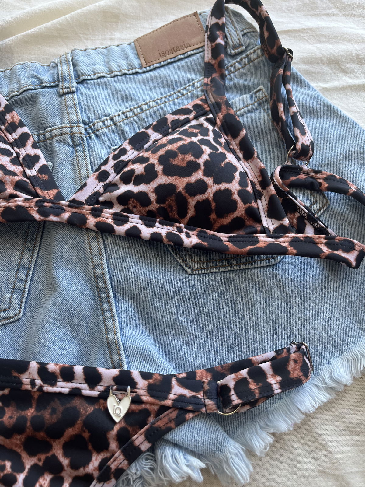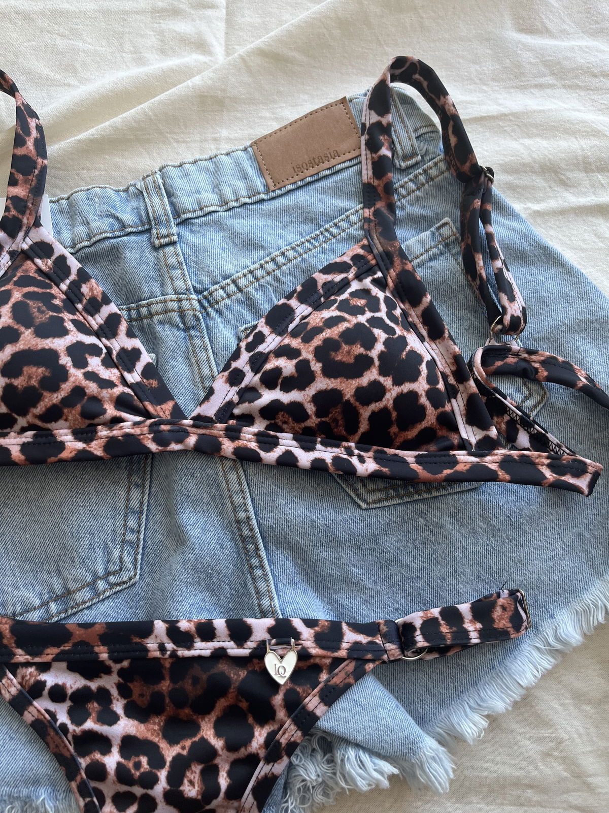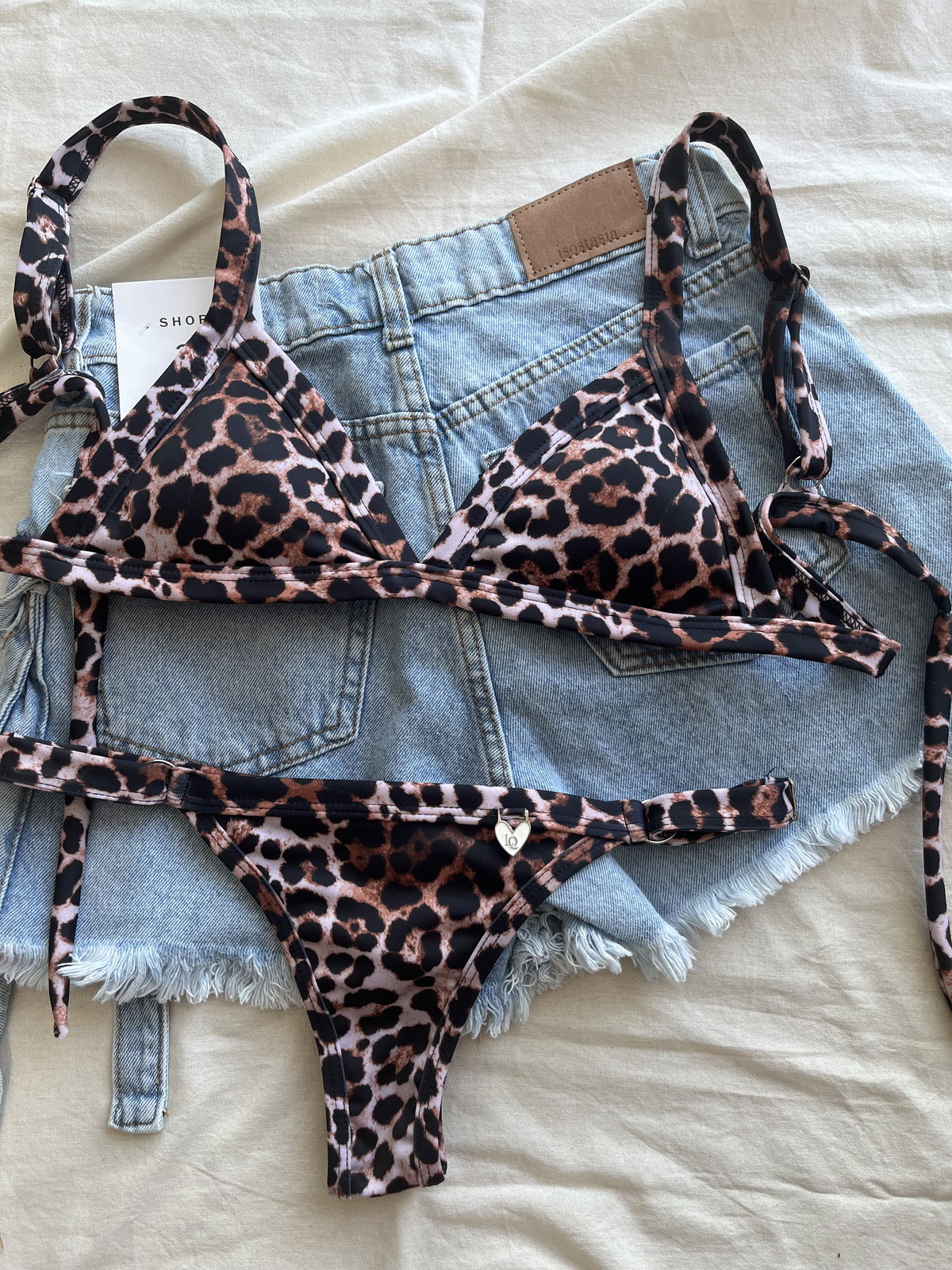 Triángulo lycra tricot con estampada exclusiva. Corpiño con breteles regulables y espalda para atar. Colaless regulable